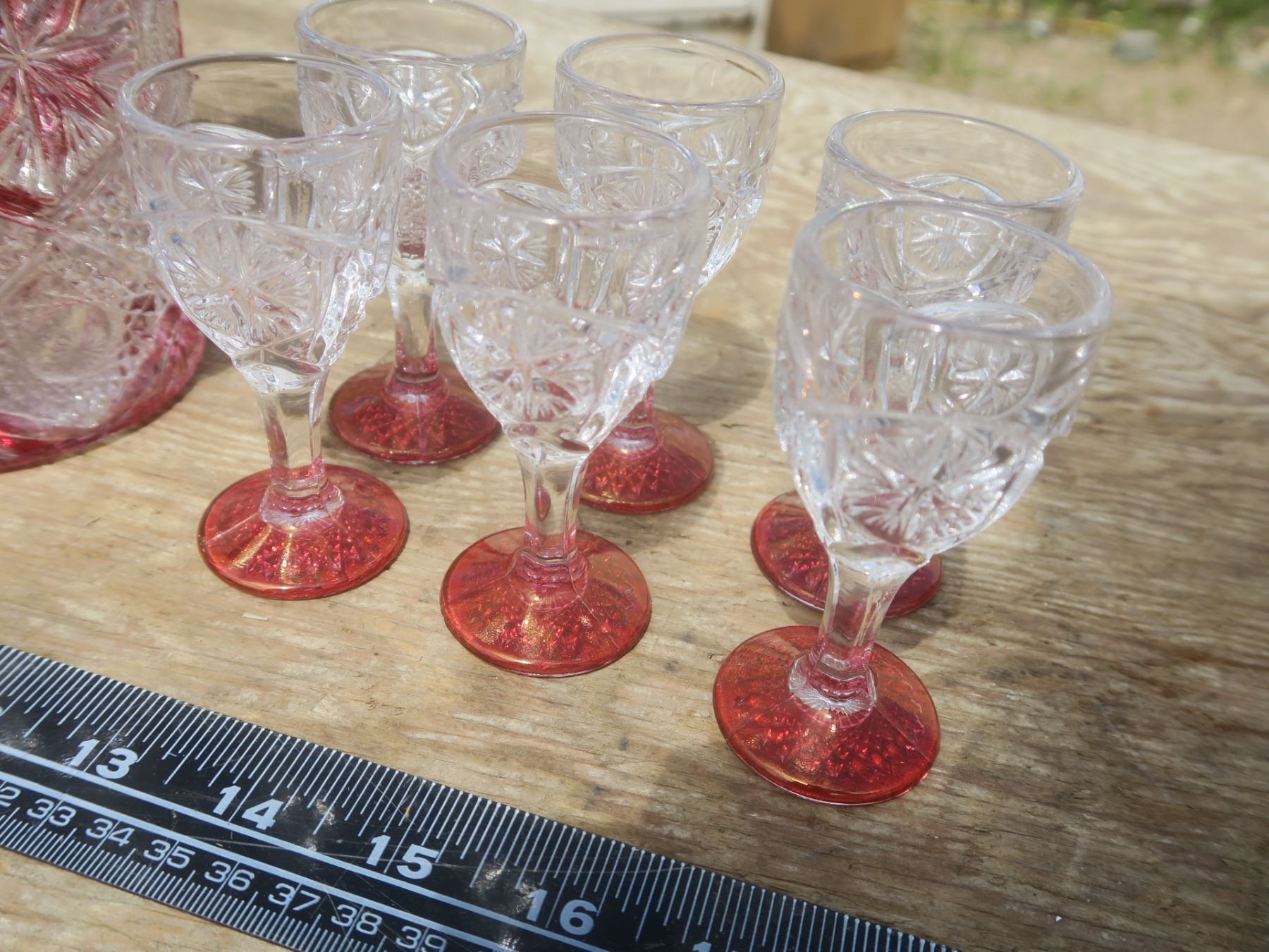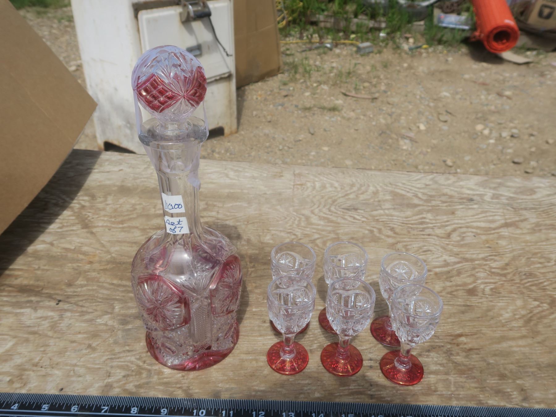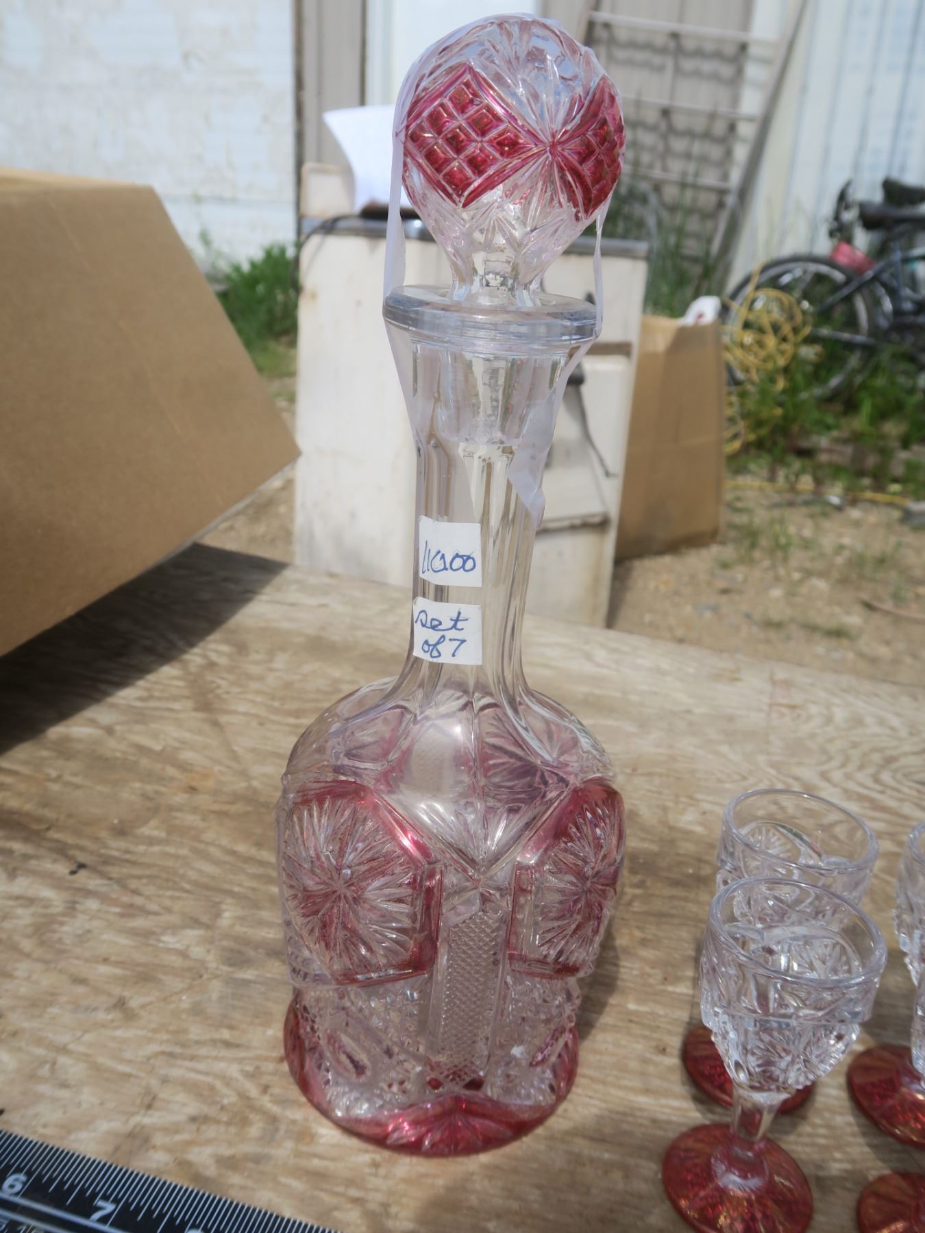 vintage cranberry decanter with glasses