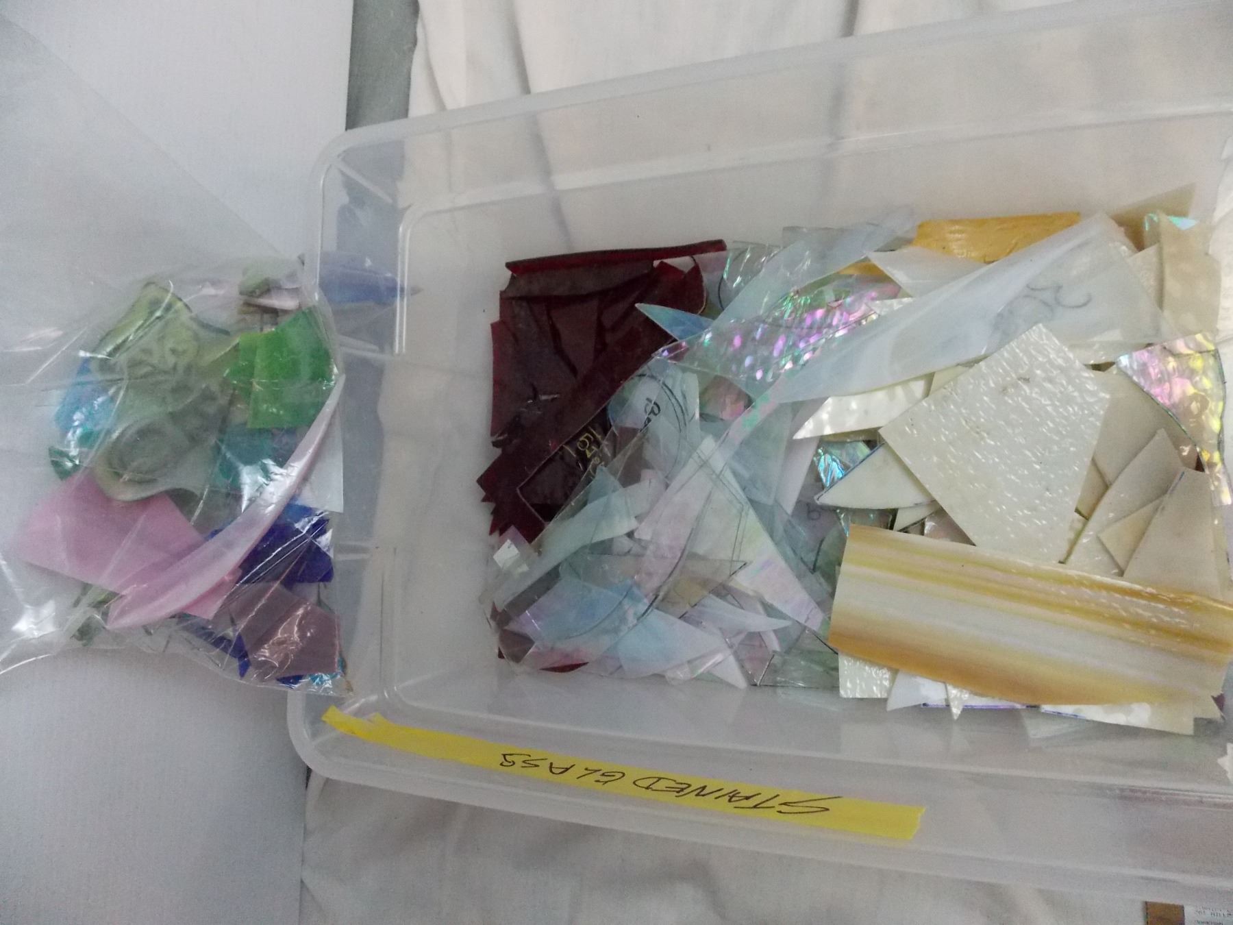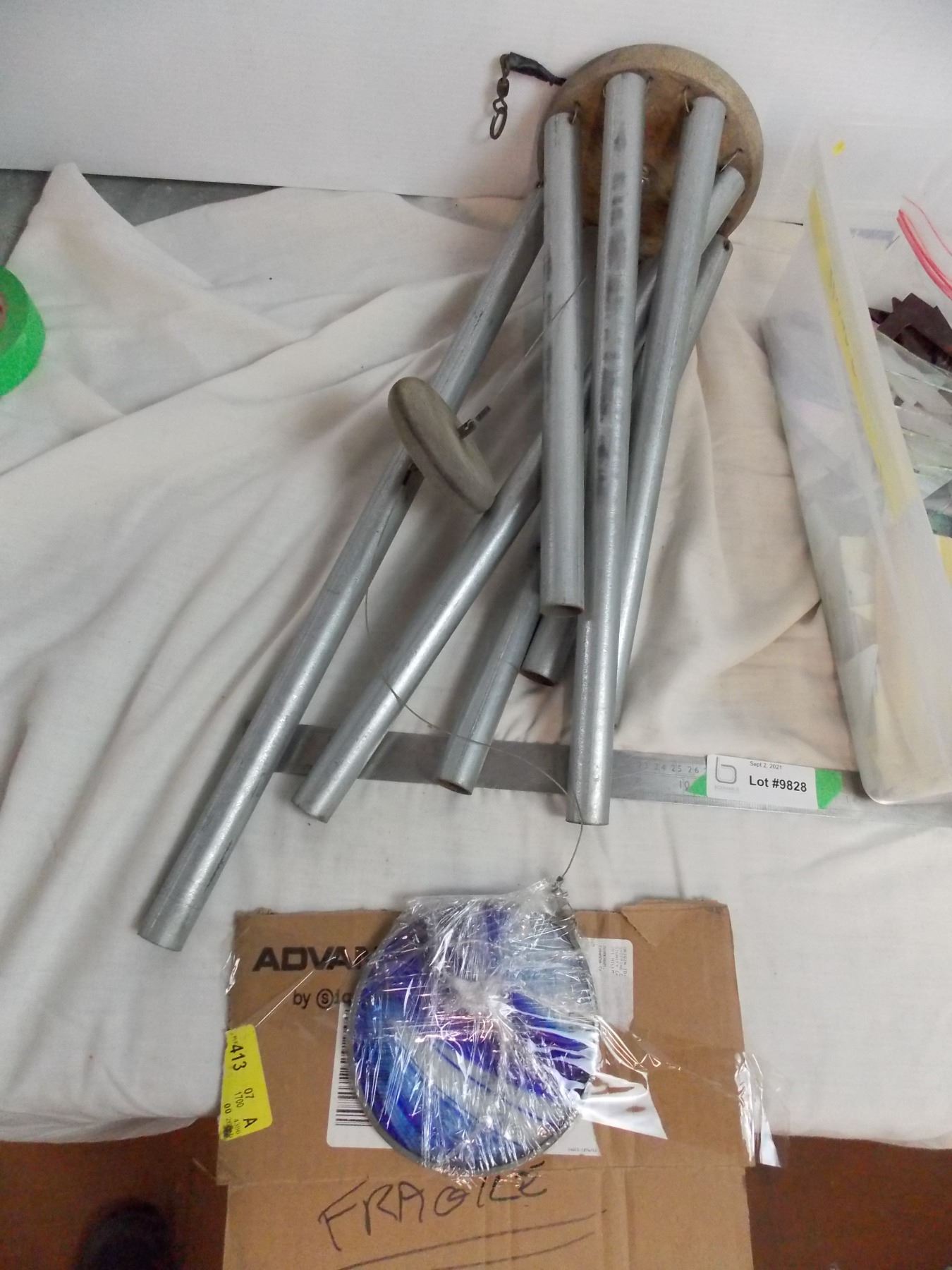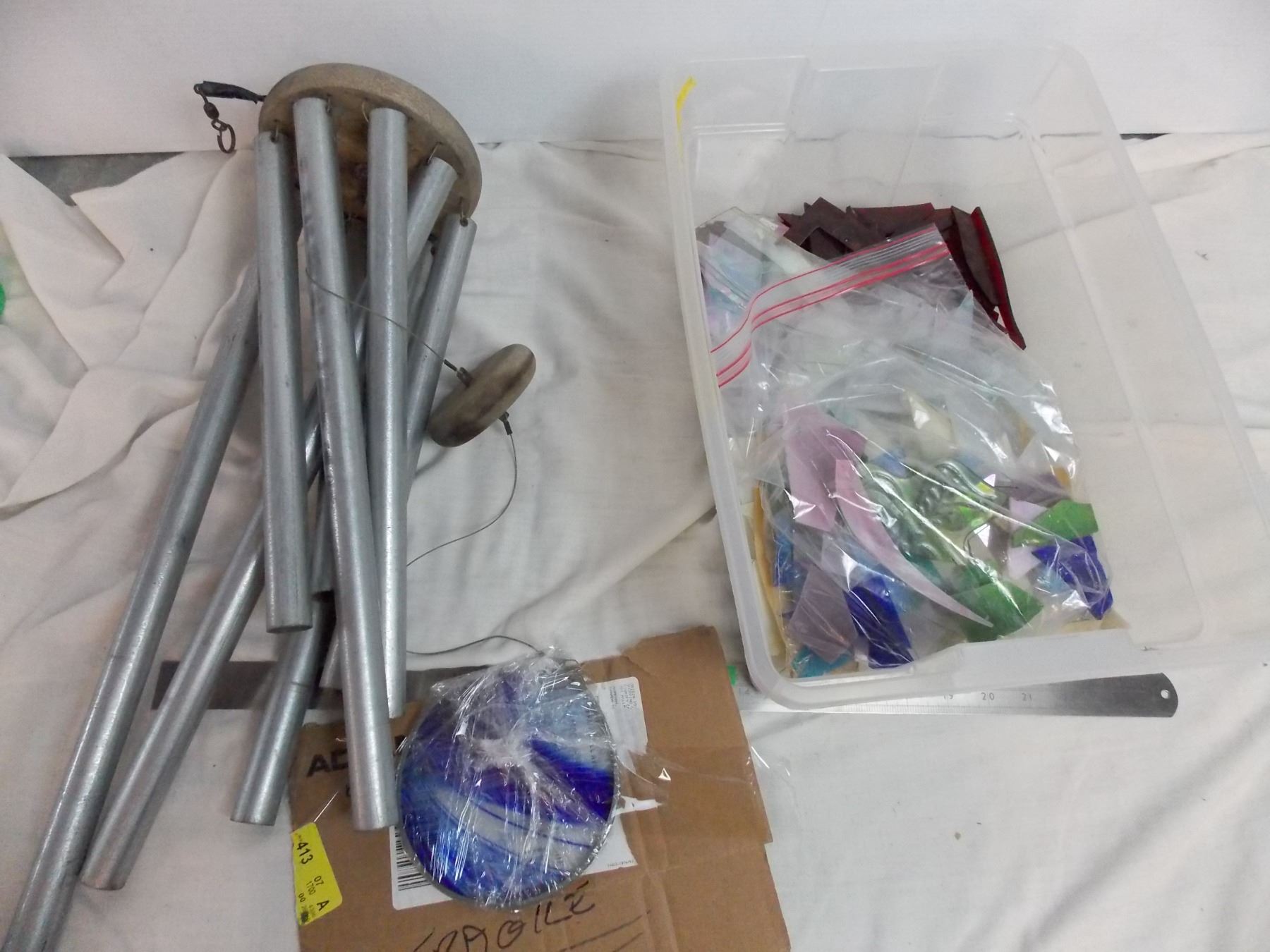 vintage windwchime + container of broken stained glass pieces