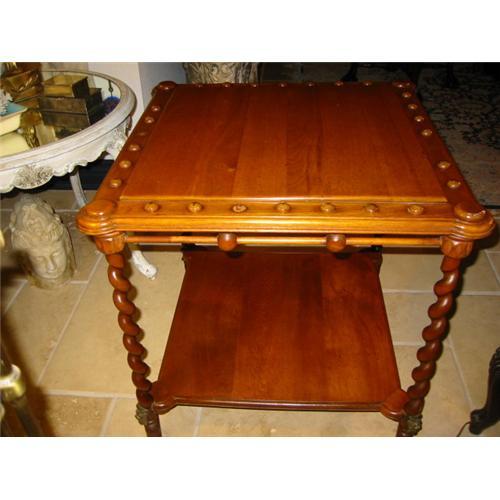 more images upon request. this table is vintage and very nice. imperfection one vintage / antique bronze leg piece is missing. couple of round accent wood piece on the table is missing. however, it can be very easy to replace. this table can be used as an occaisonal or end table. the wood is walnut. it has four legs and two sections. it is very decorative and very functional. measures approx. 23 inches tall - 23 inches wide and is square shape. other than missing the metal piece and two round wood accent, it is in great condition being very vintage.