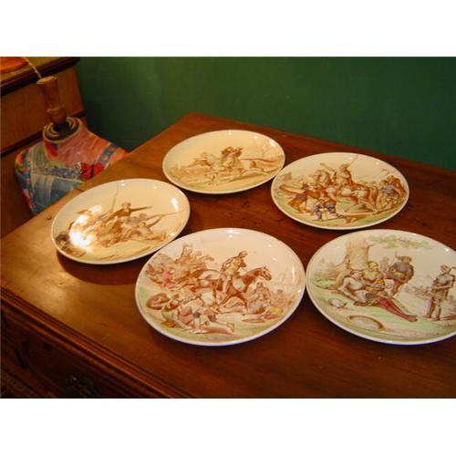 a set of 5 Sarreguemines plates about the wars and warriors in france , including 2 about Napoleon`s war . beginning of the 19 century , very collectable , very valuable .