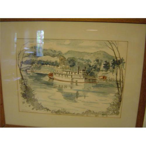 margery Clark . " Sternwheelers - port Amherst , Kanawha river " pen and ink and watercolor signed and dated lower right , title lower left .