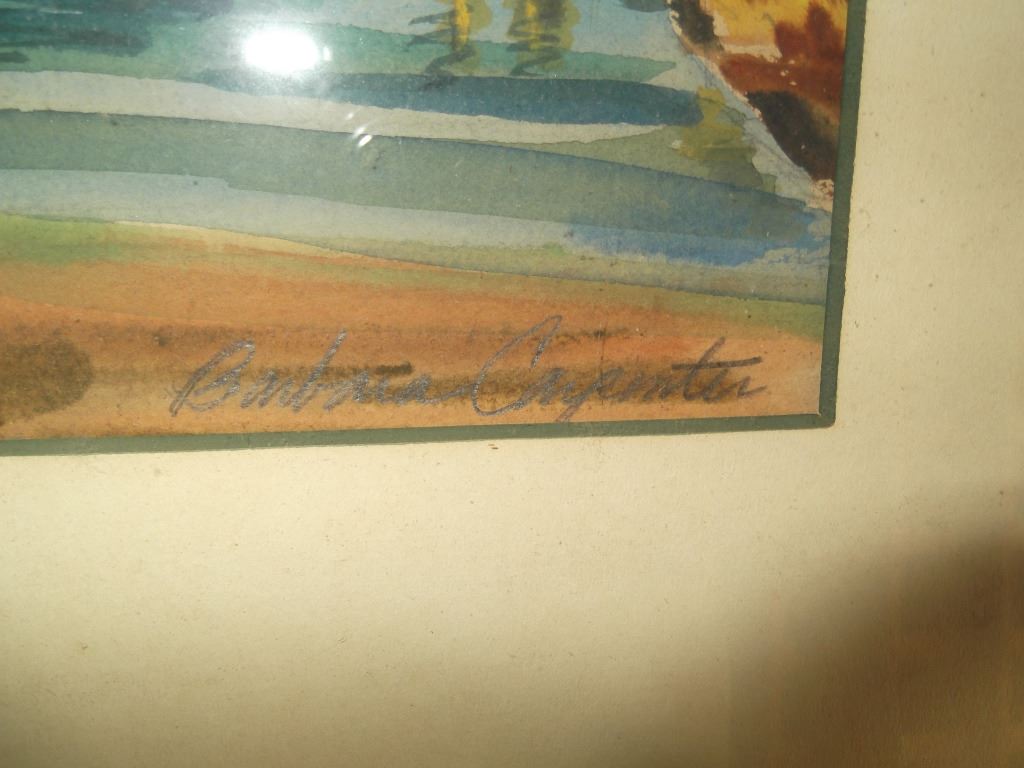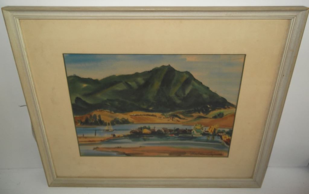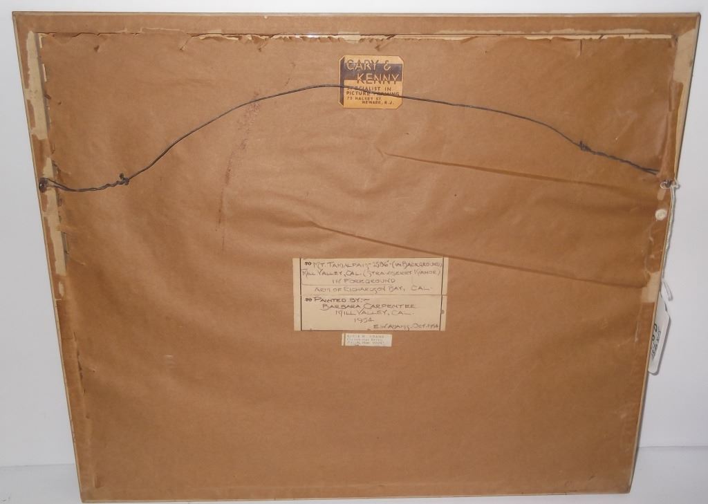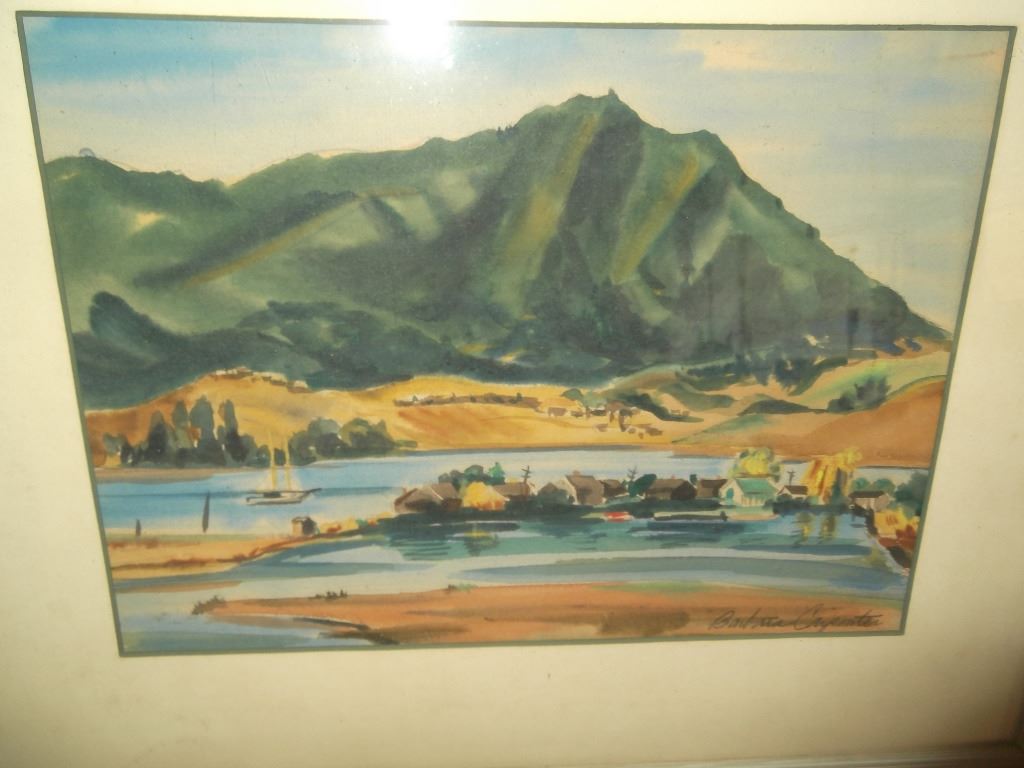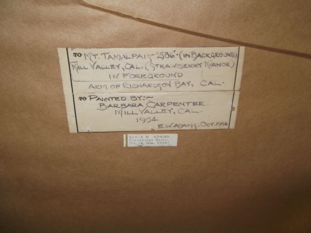 Strawberry Manor (in foreground) California watercolor signed Barbara Carpenter, c. 1954. 18 1/2 inches x 15 inches.