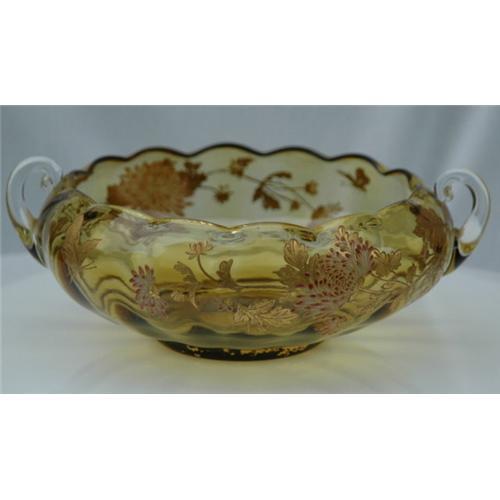 Unsigned, but definitely cries of Webb a two-handle bowl or bride's basket. The color is chartreuse or lime green. Actually, it is a little different in varying light. It is 3 3/4" tall, and at its widest is 8 3/4". There are two hand applied crystal handles, both without any heat checks. The top rim is fire polished smooth, with a slight roll and some of the gold overlay remains on the rim. There are four insects in different areas of the bowl. One is a beetle, one is a butterfly, and the othe two, I am not sure if they are suppose to represent bees or butterflies. The gold enameling, I would say, ninety-nine percent in tact. Lovely flowers in a rose pink. There is no damage to this entire piece. Ca. probably 1880's. No signature. Very large round polish pontil with appropriate age marks surrounding the pontil.