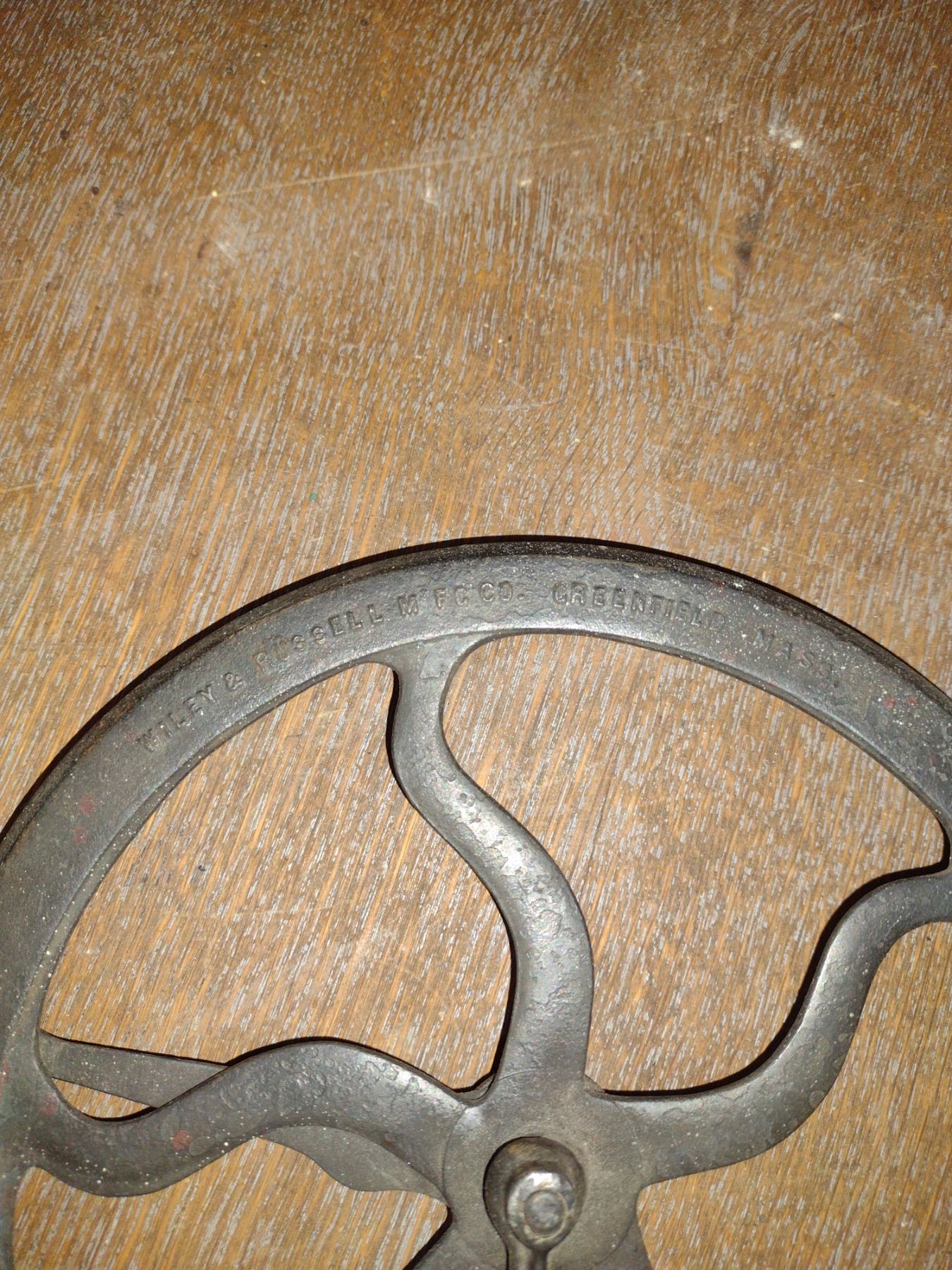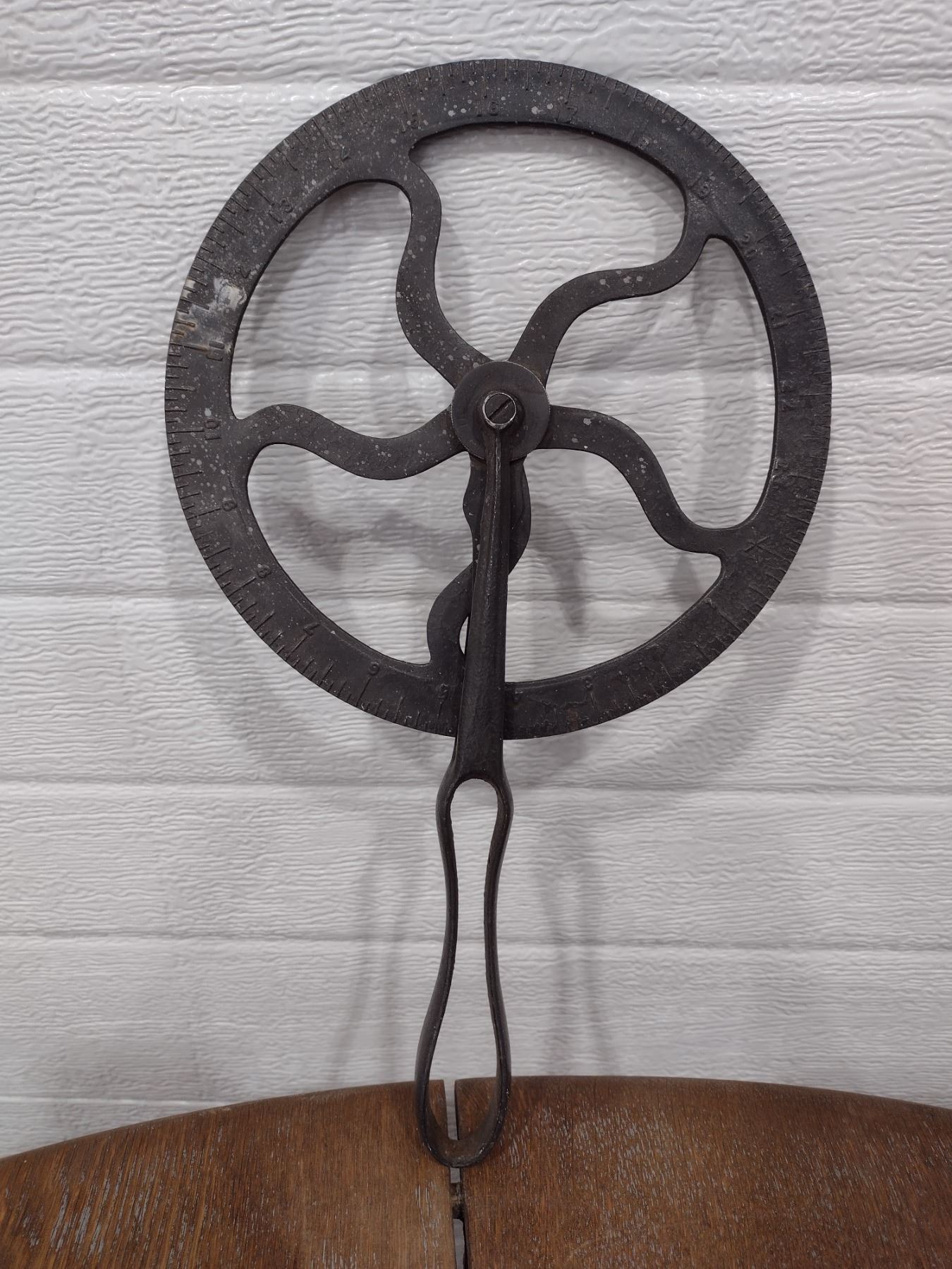 Hand tool for measuring the circumference of a wagon wheel to know how much steel to cut for the rim.