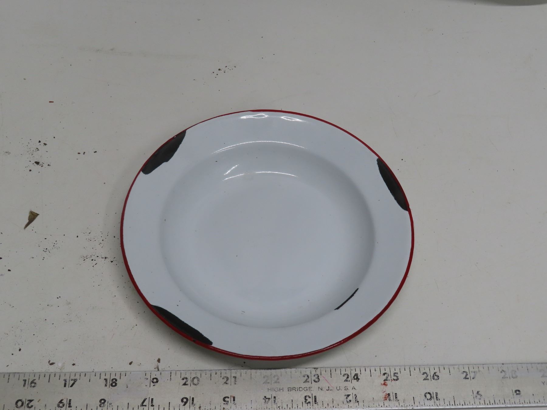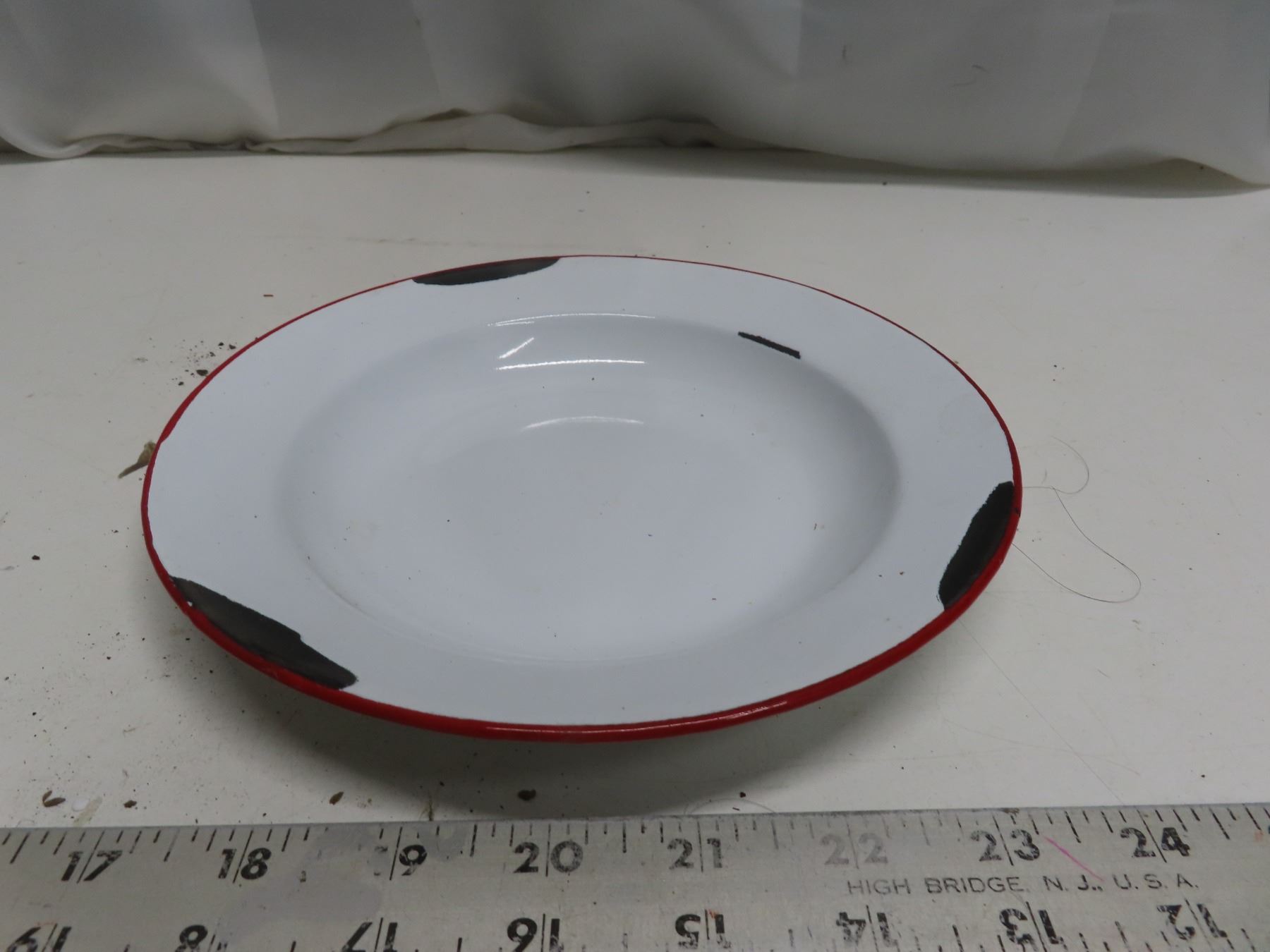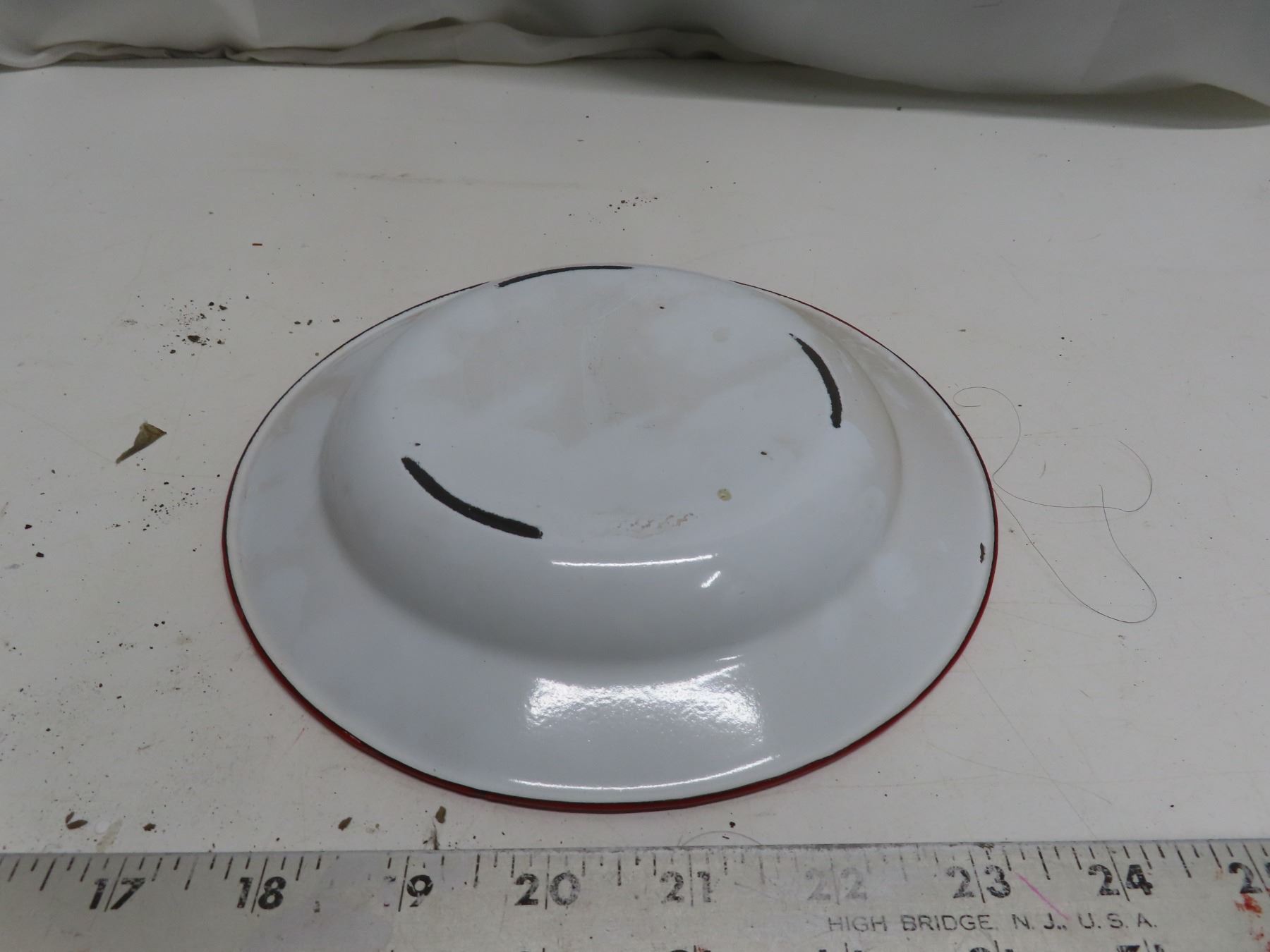 white enamel ware plate with red trim