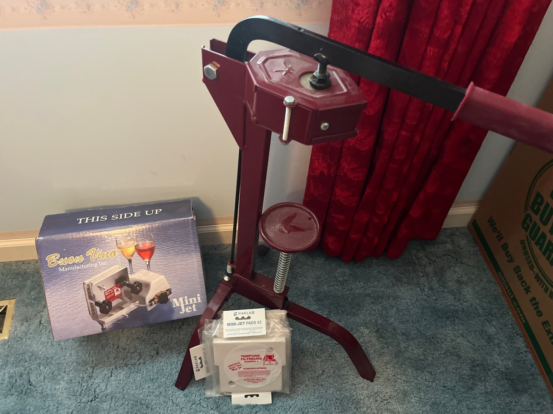 wine making equipment bottle, corker and mini jet filter with extra mini jet pads/filters in new condition