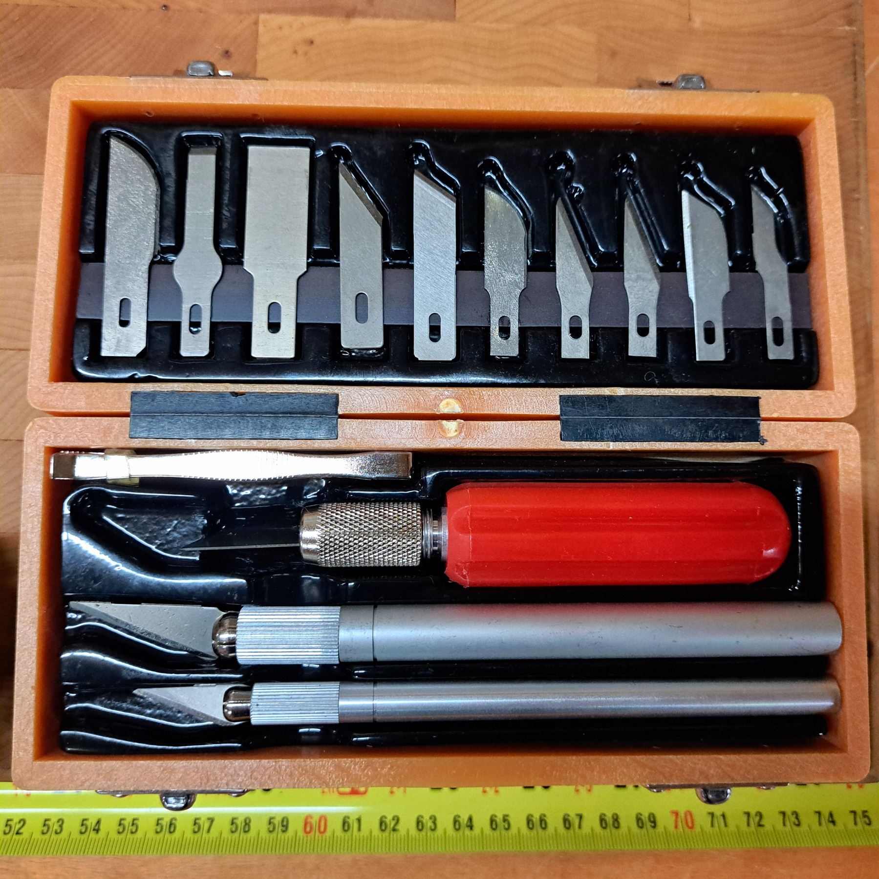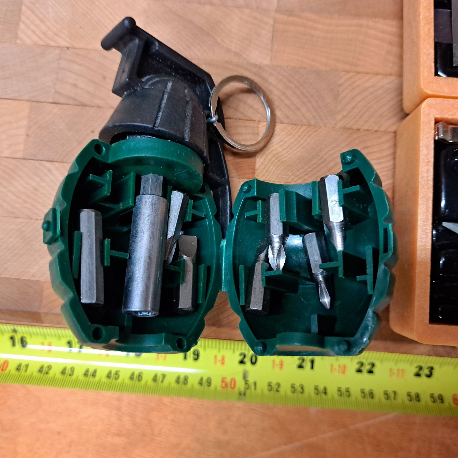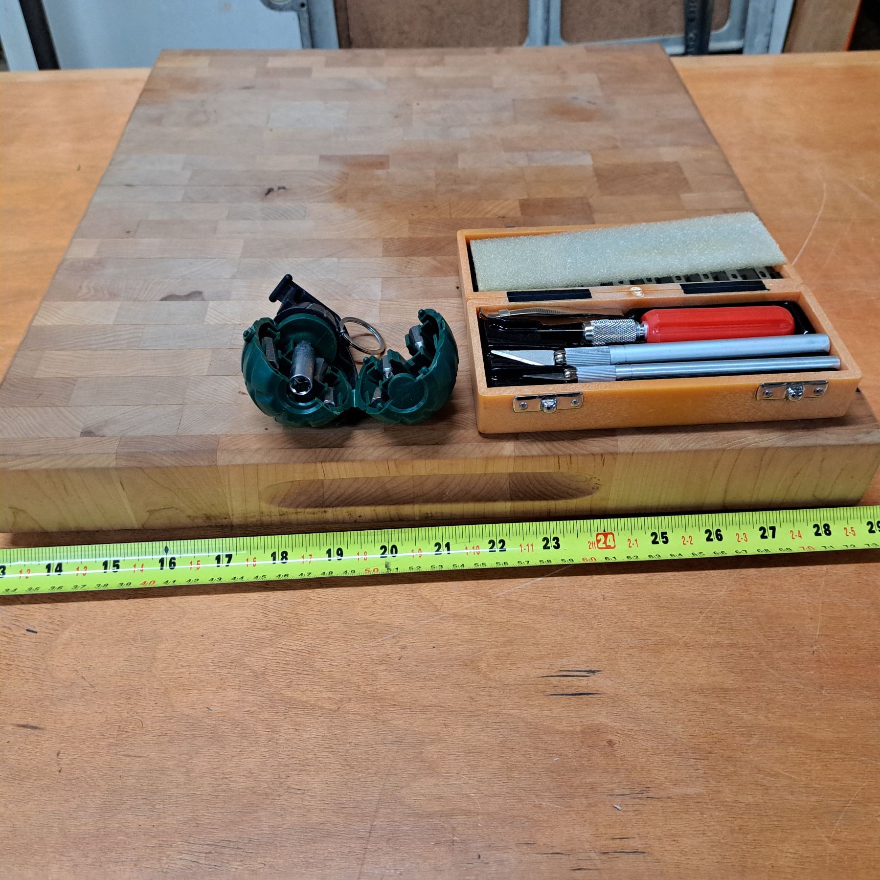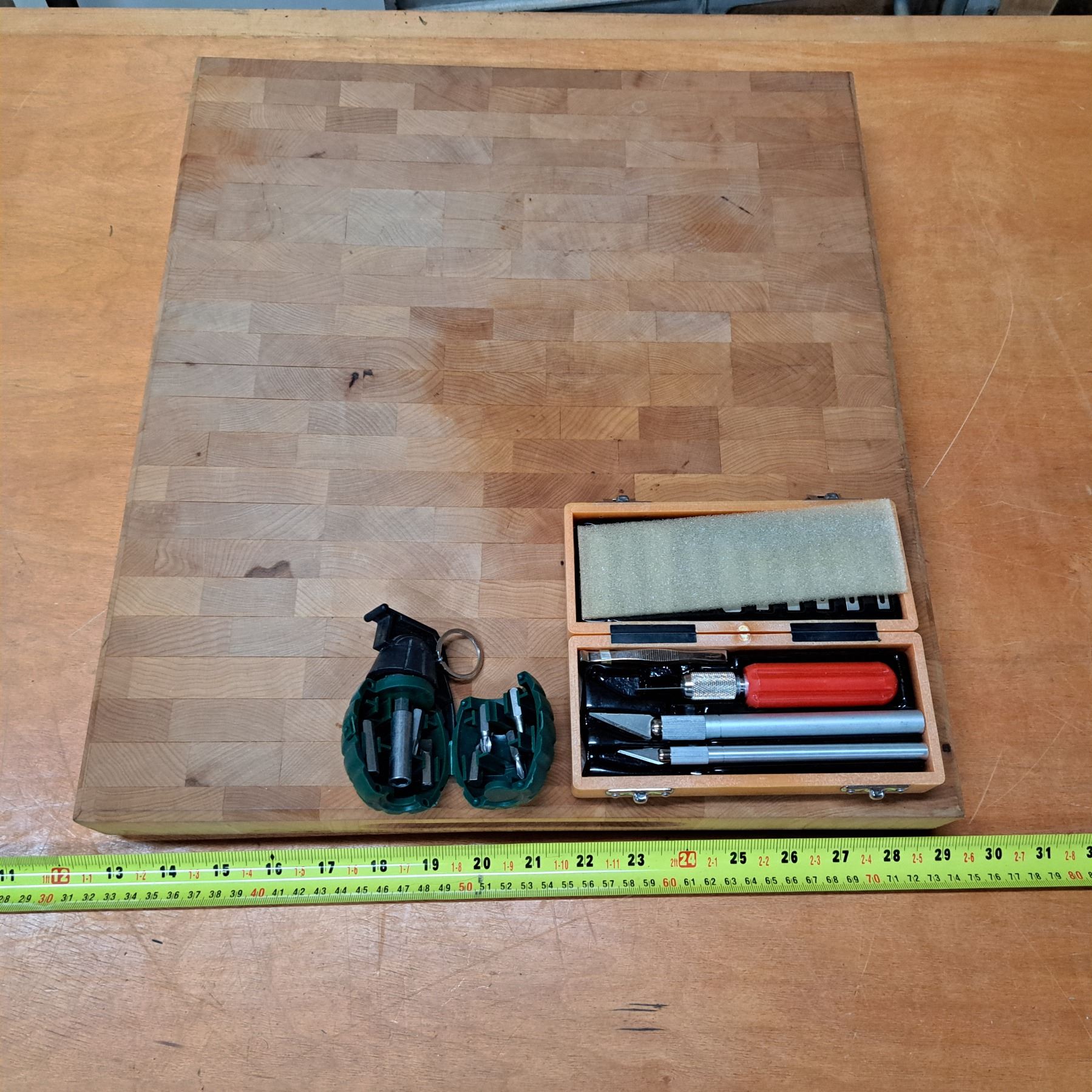 wood block with scalpel and screw driver-set looks like a grenade