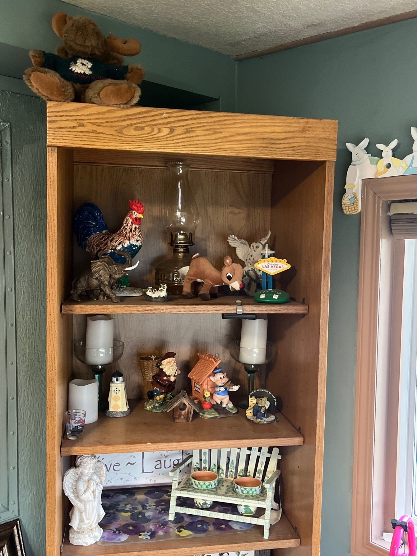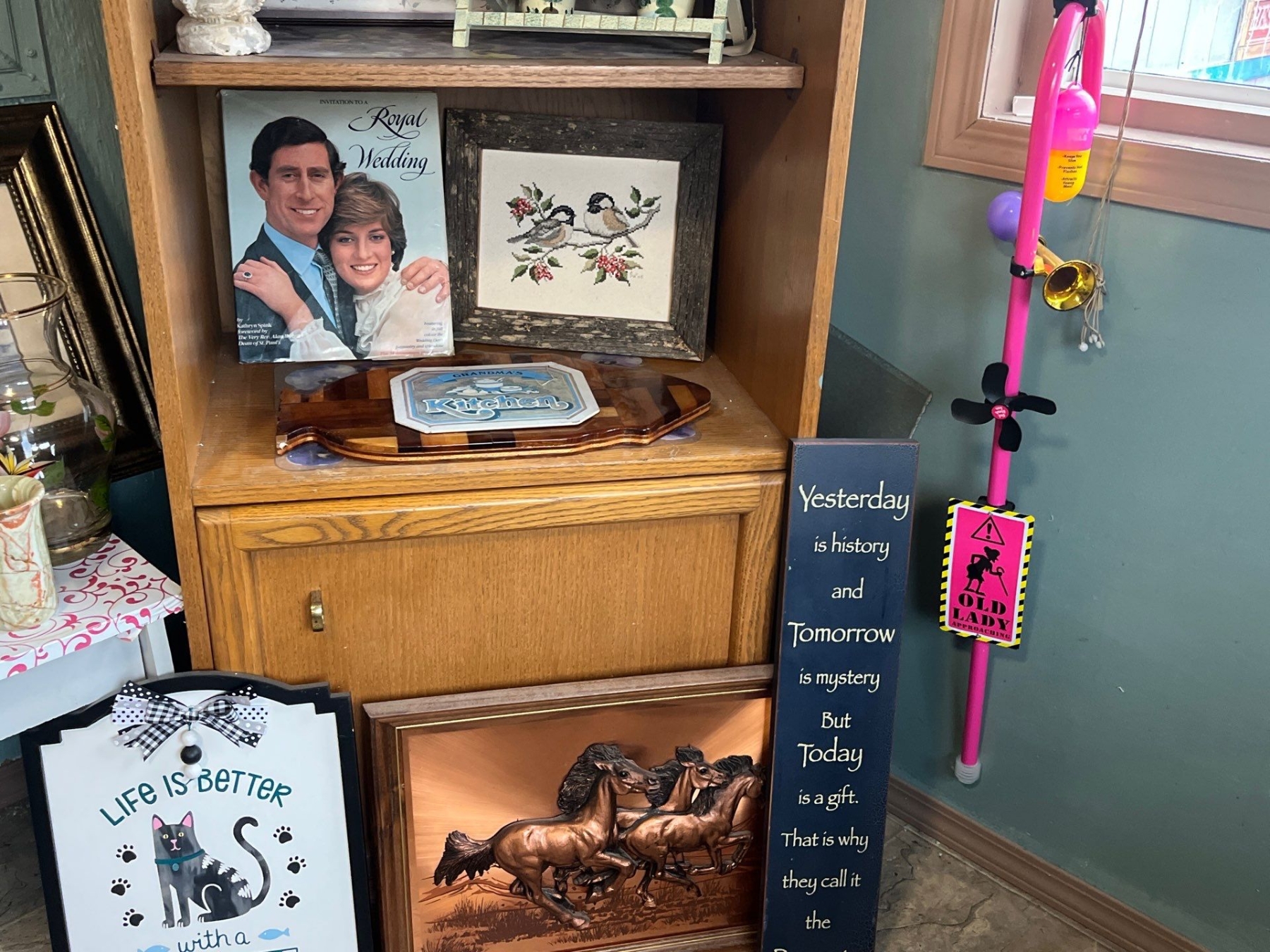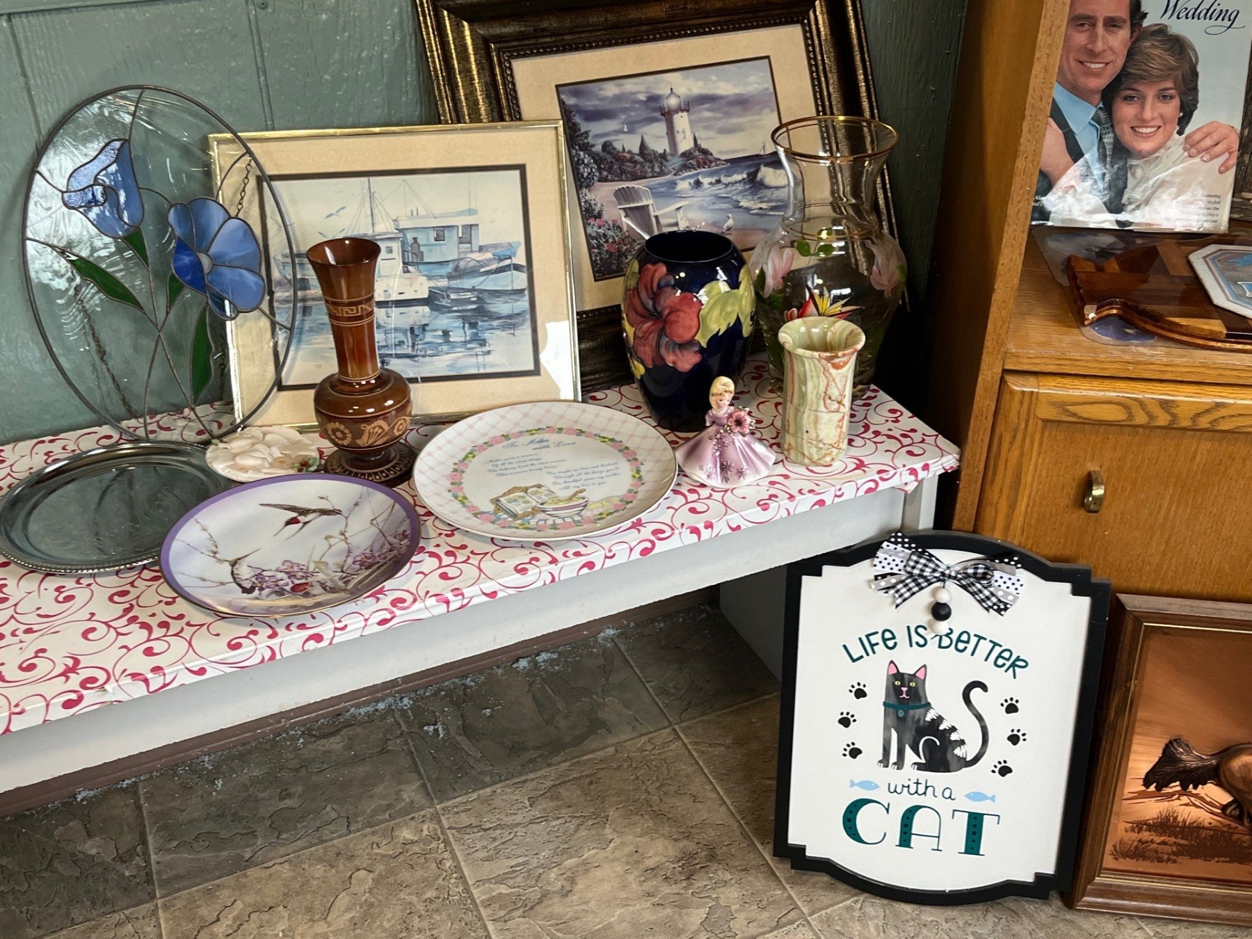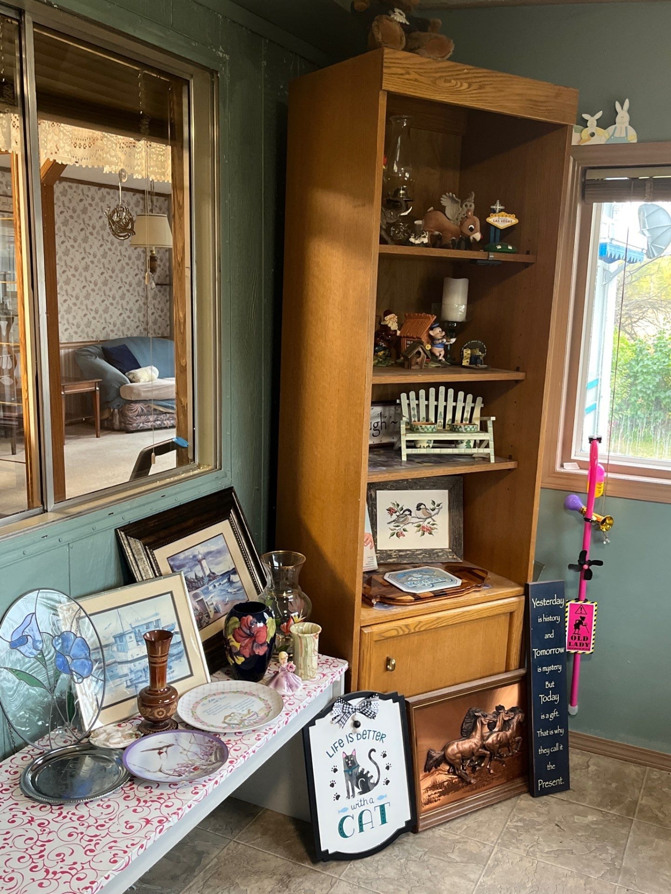 wood cabinet with a number of collectables pictures picture frames. Also sold this one lot.