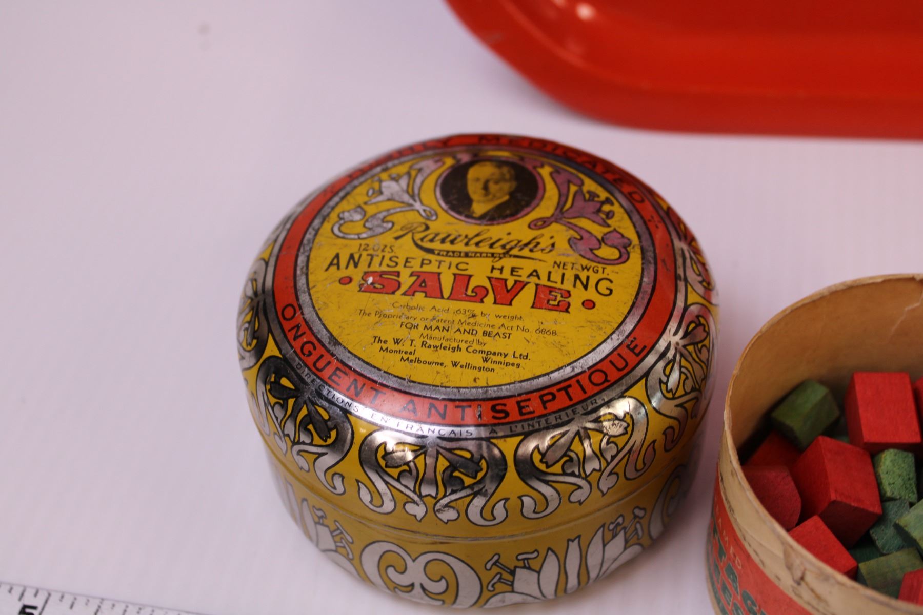 wooden Box w/ 5 Silver Plated Pickle Forks and 4 Silver Plated Spreaders, (3) Tea Spoons, Tin Tray and Misc