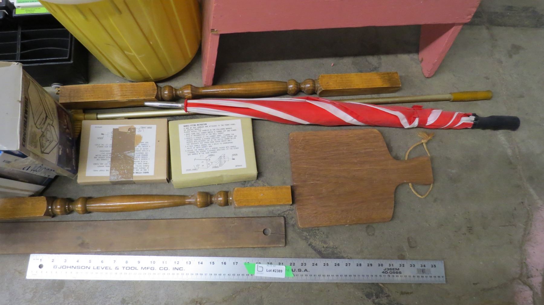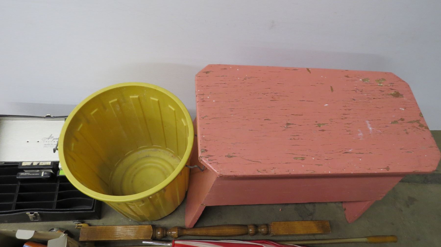 *wooden bench, shelf, garbage can, misc