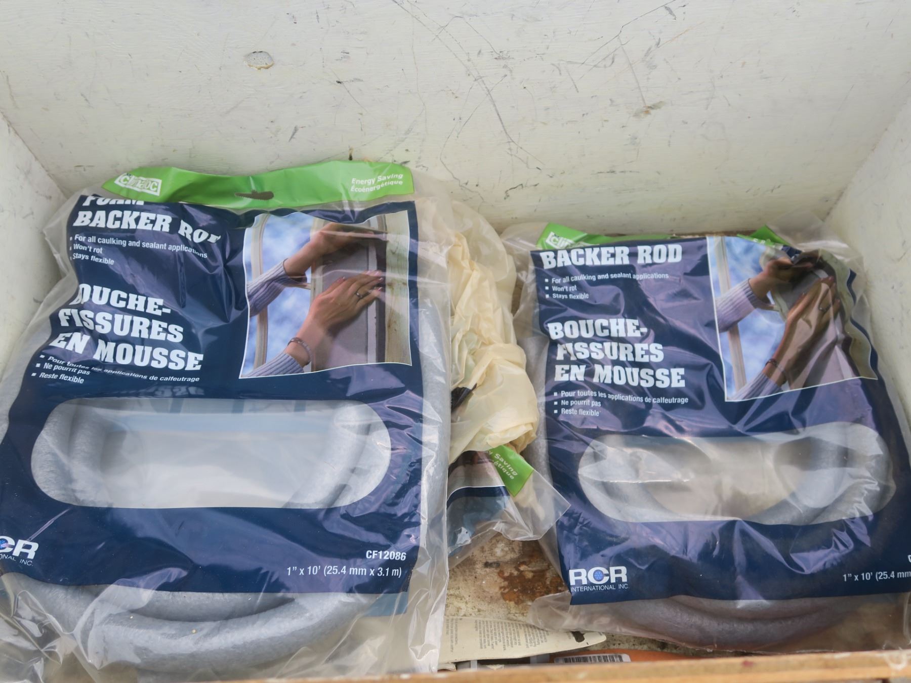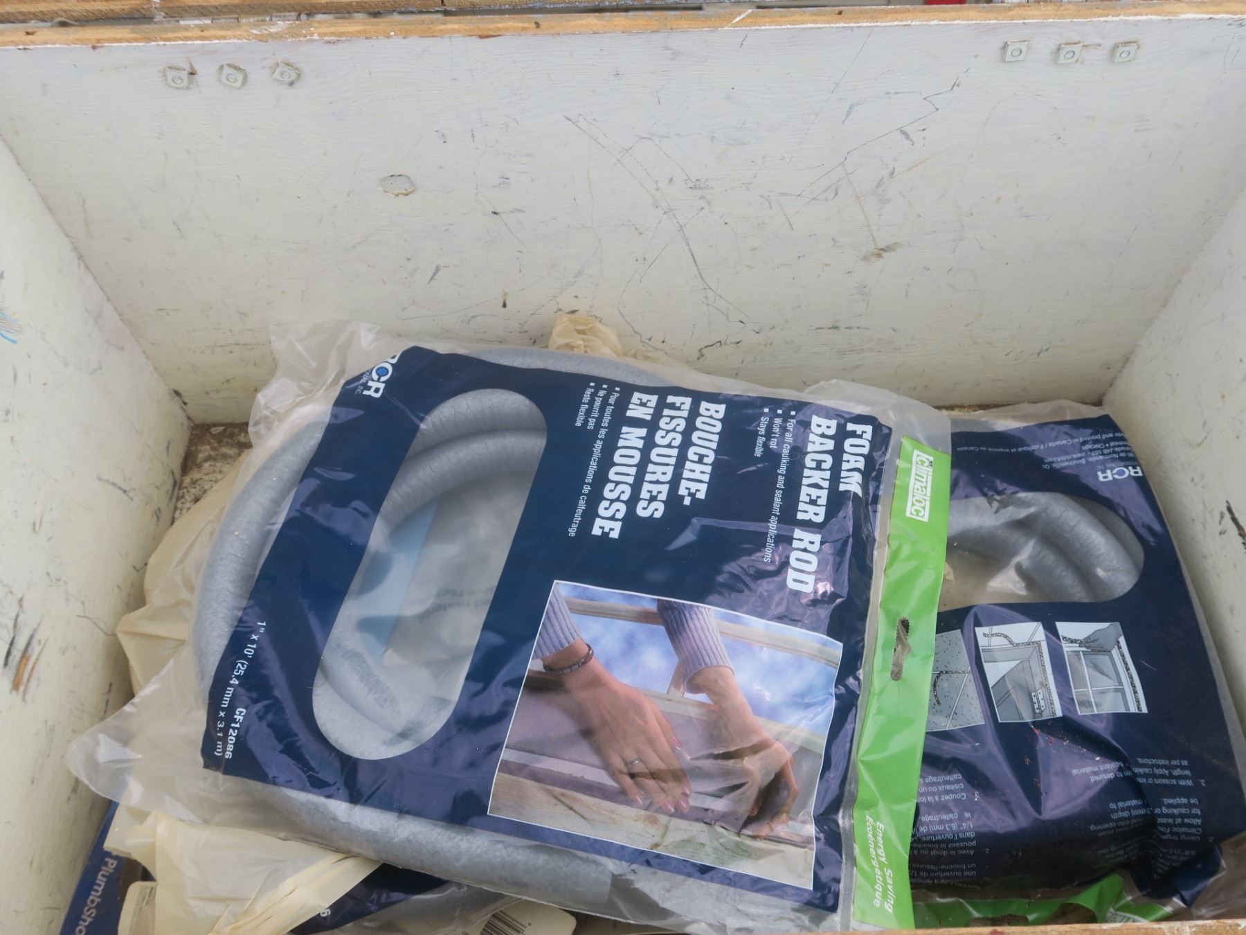 wooden box full of foam backer rods