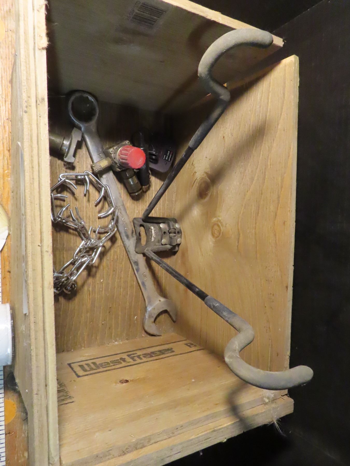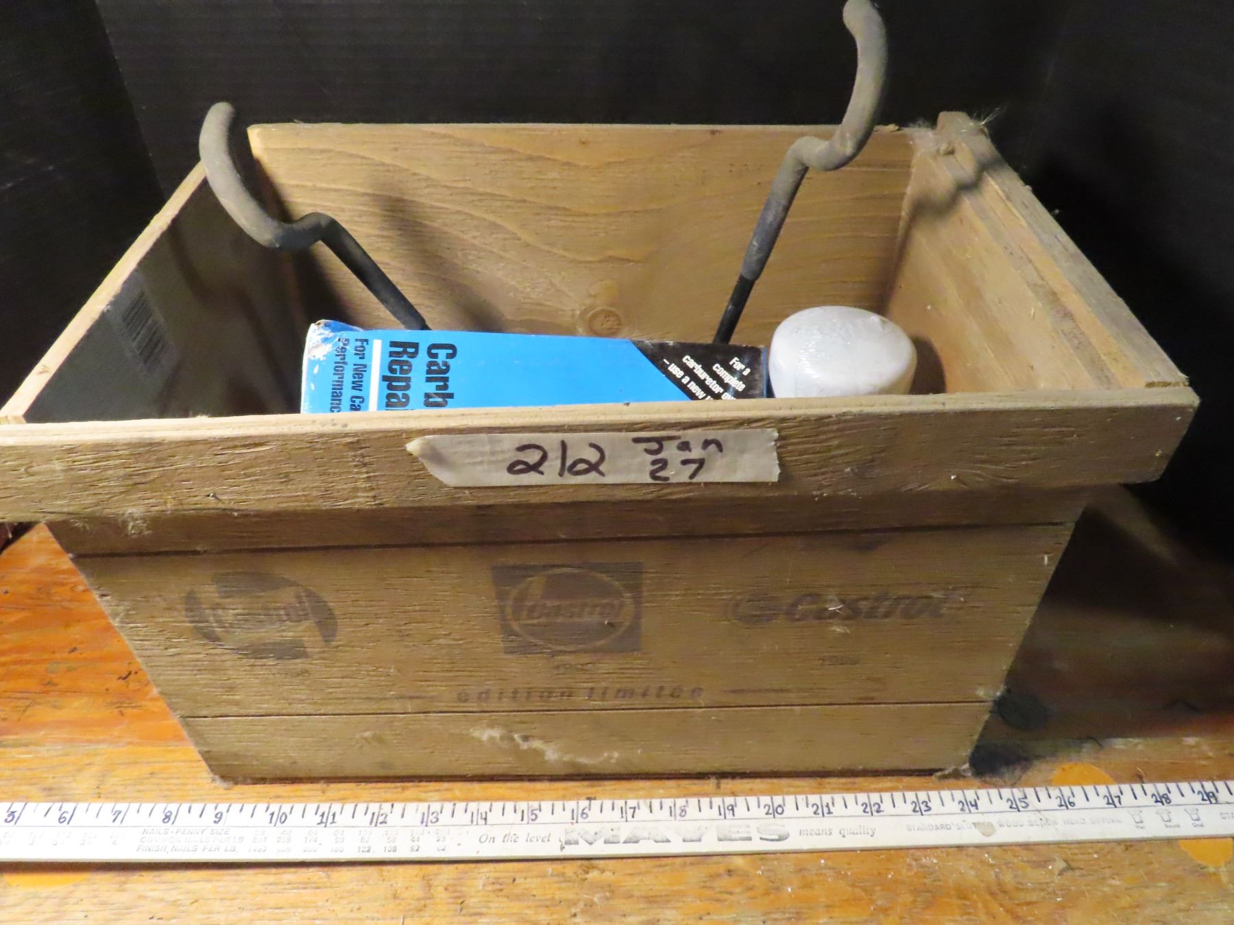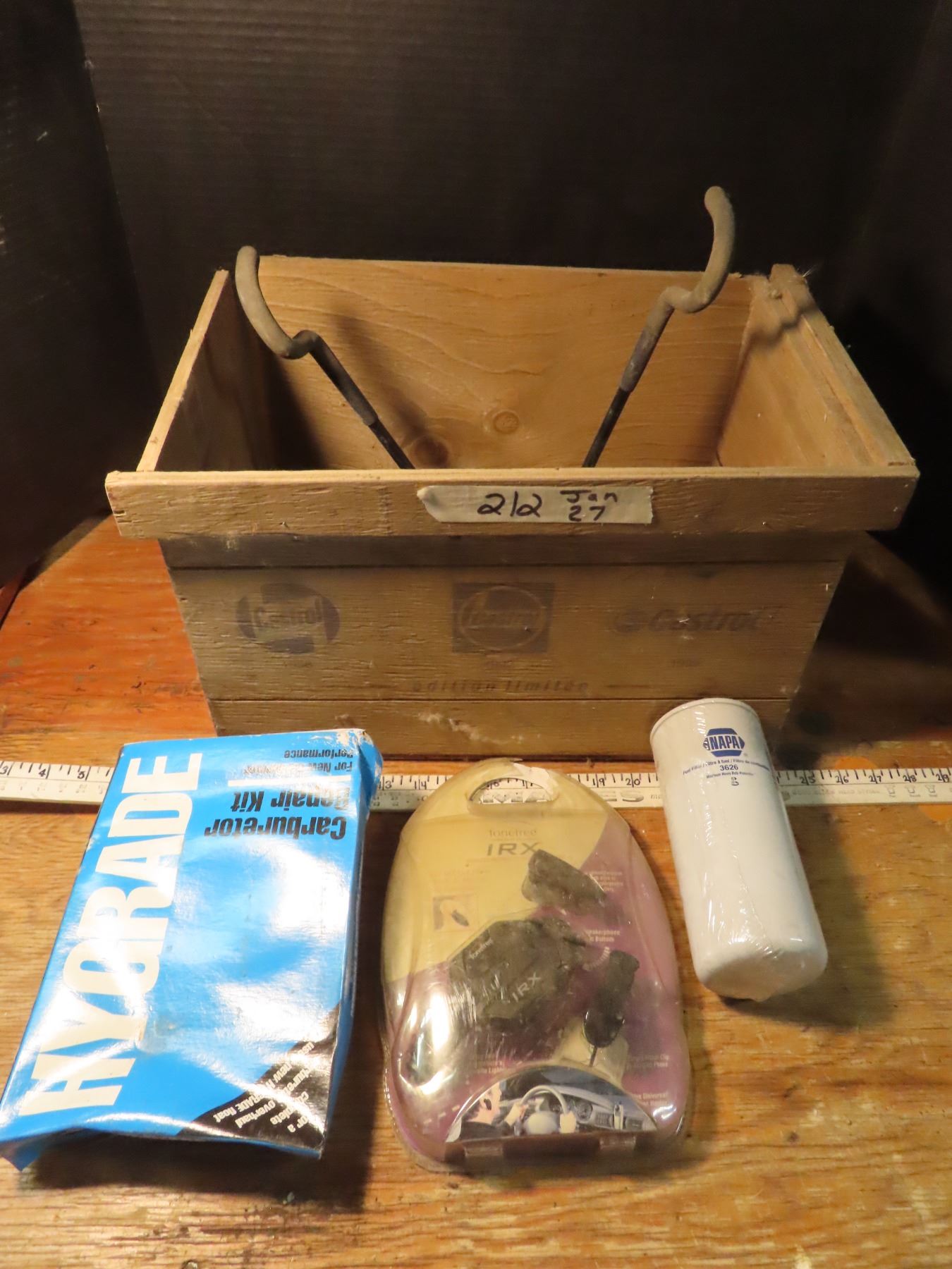 wooden castrol box with shop hooks , car audio