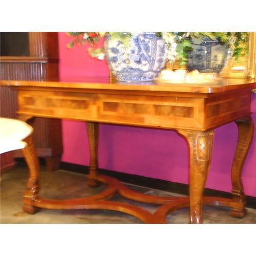 beautiful nutwood writing table, one drawer on a side and on the other side a display to write on, on the sides beautiful inlay of different colors of nutwood