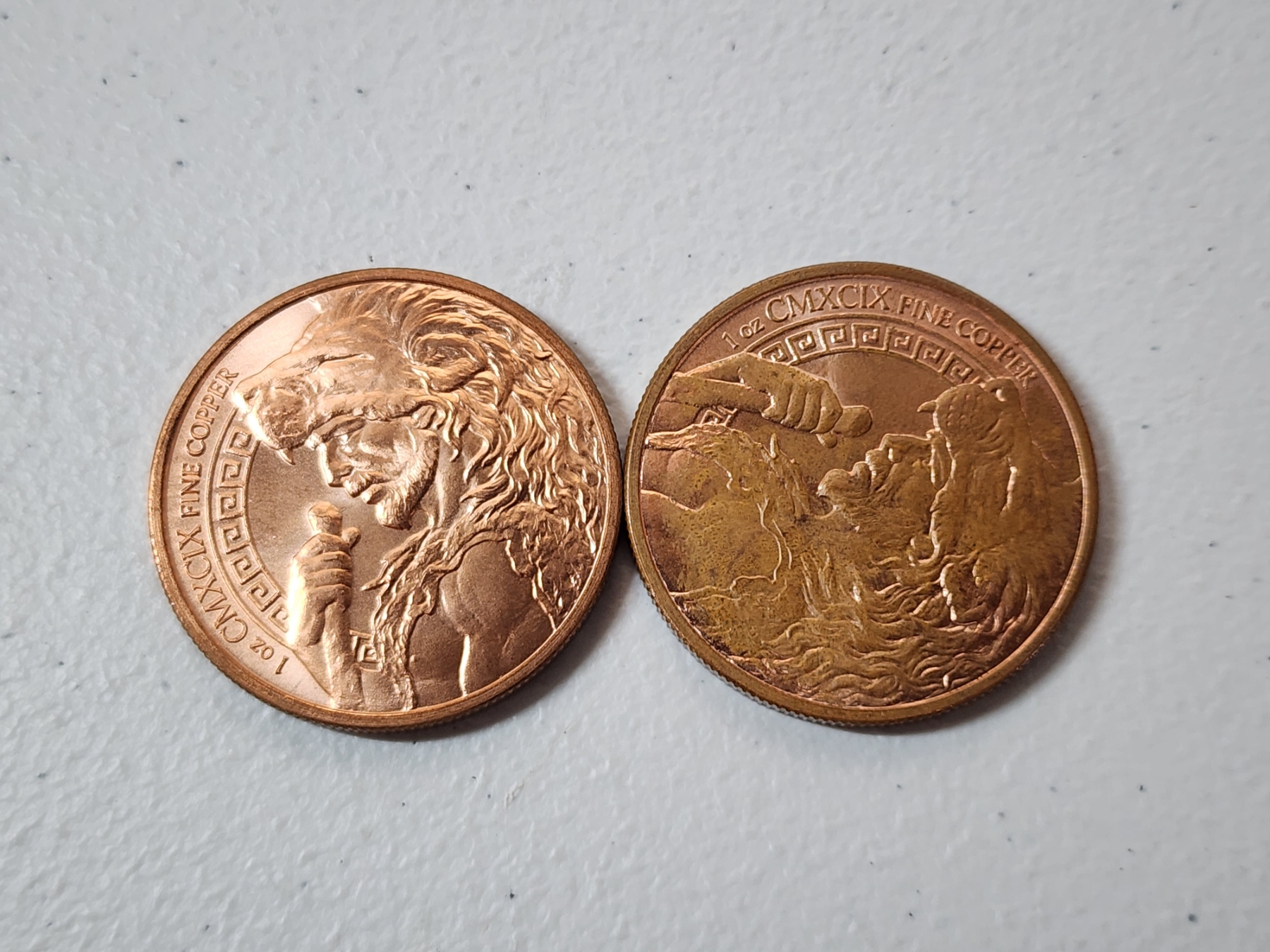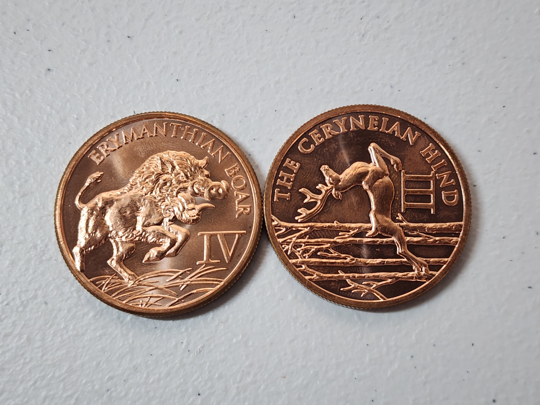 x2 1 oz Fine Copper Rounds: The Ceryneian Hind & Erymanthian Boar