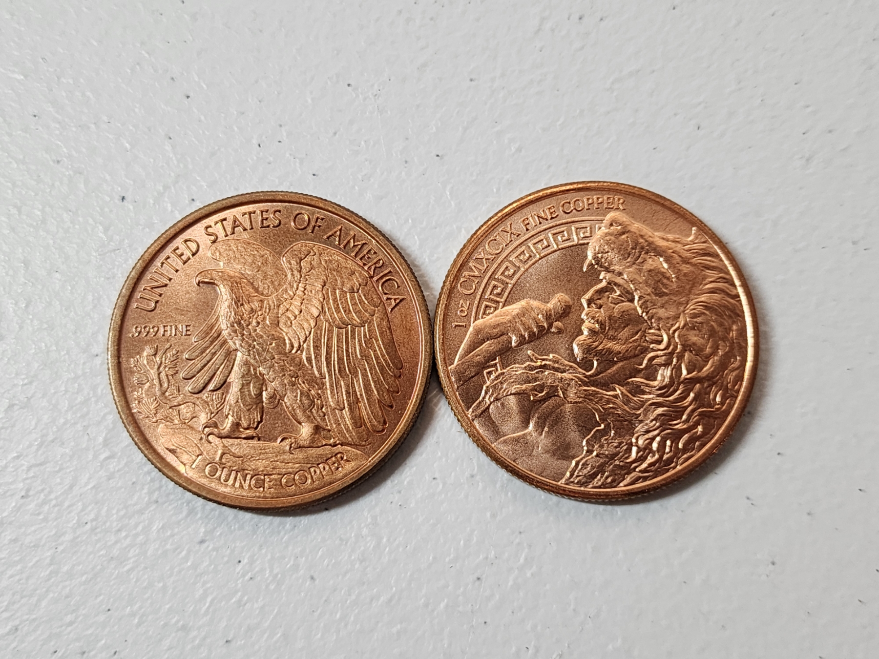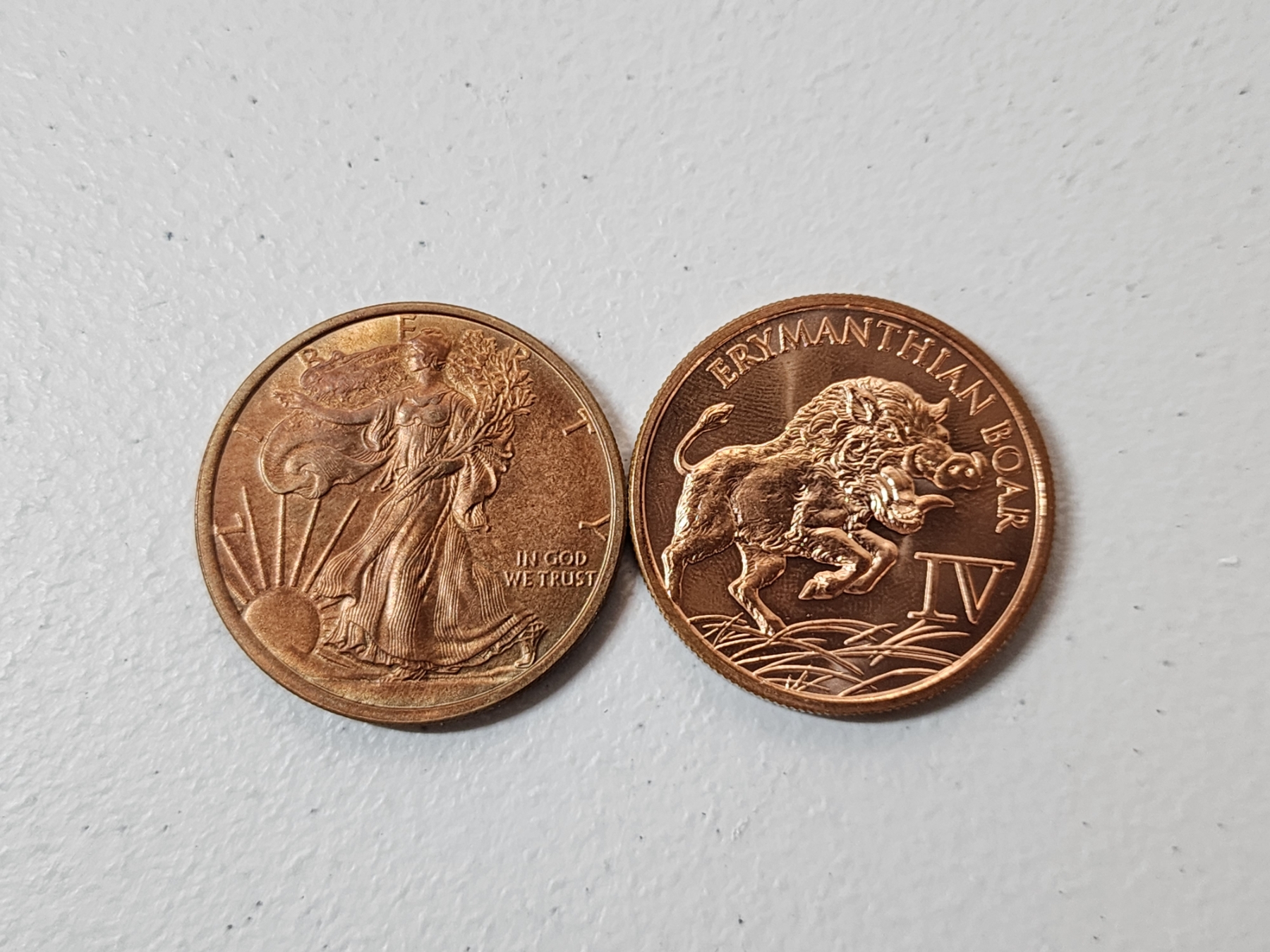 x2 1 oz Fine Copper Rounds: Walking Liberty & Erymanthian Boar