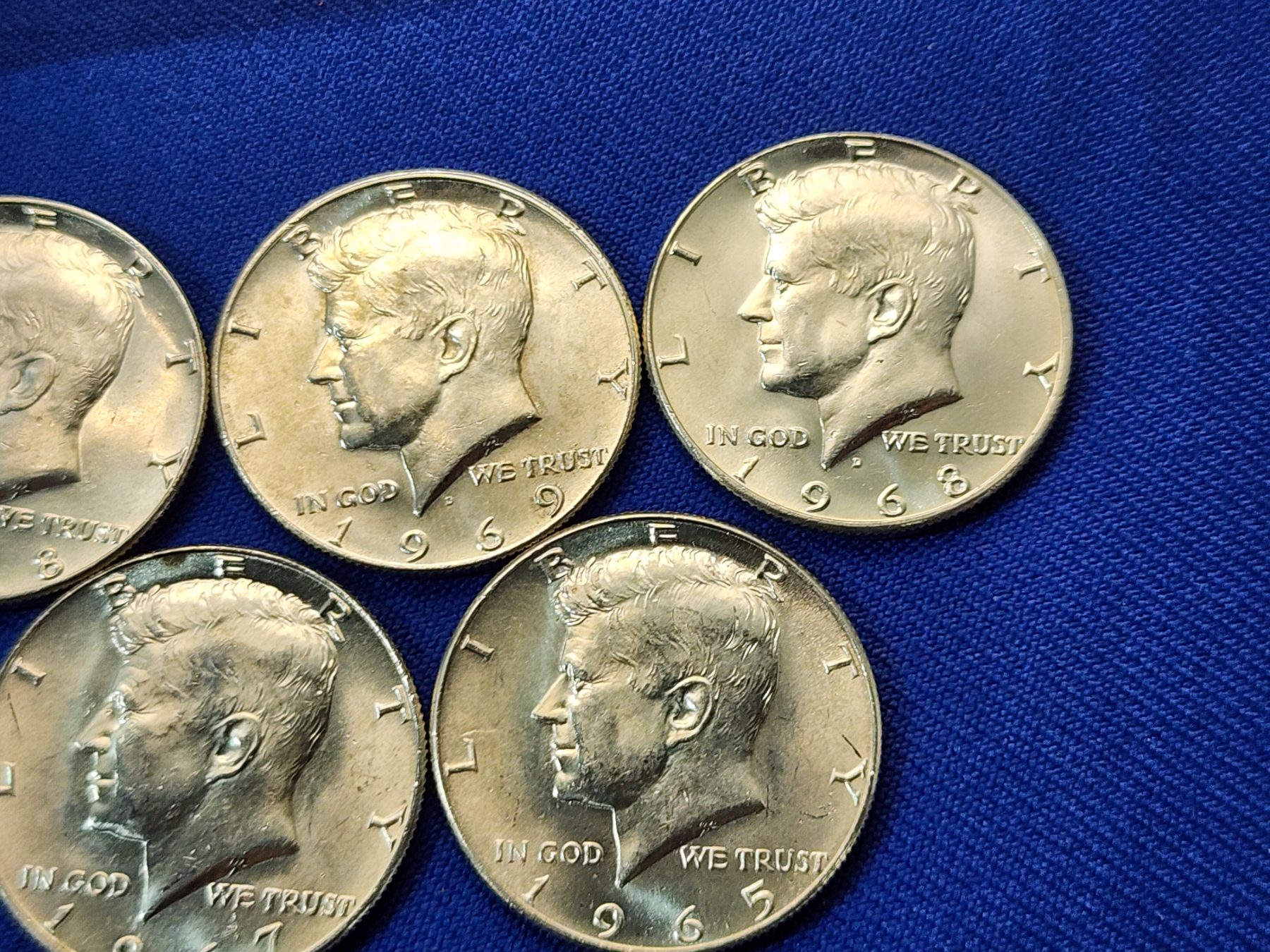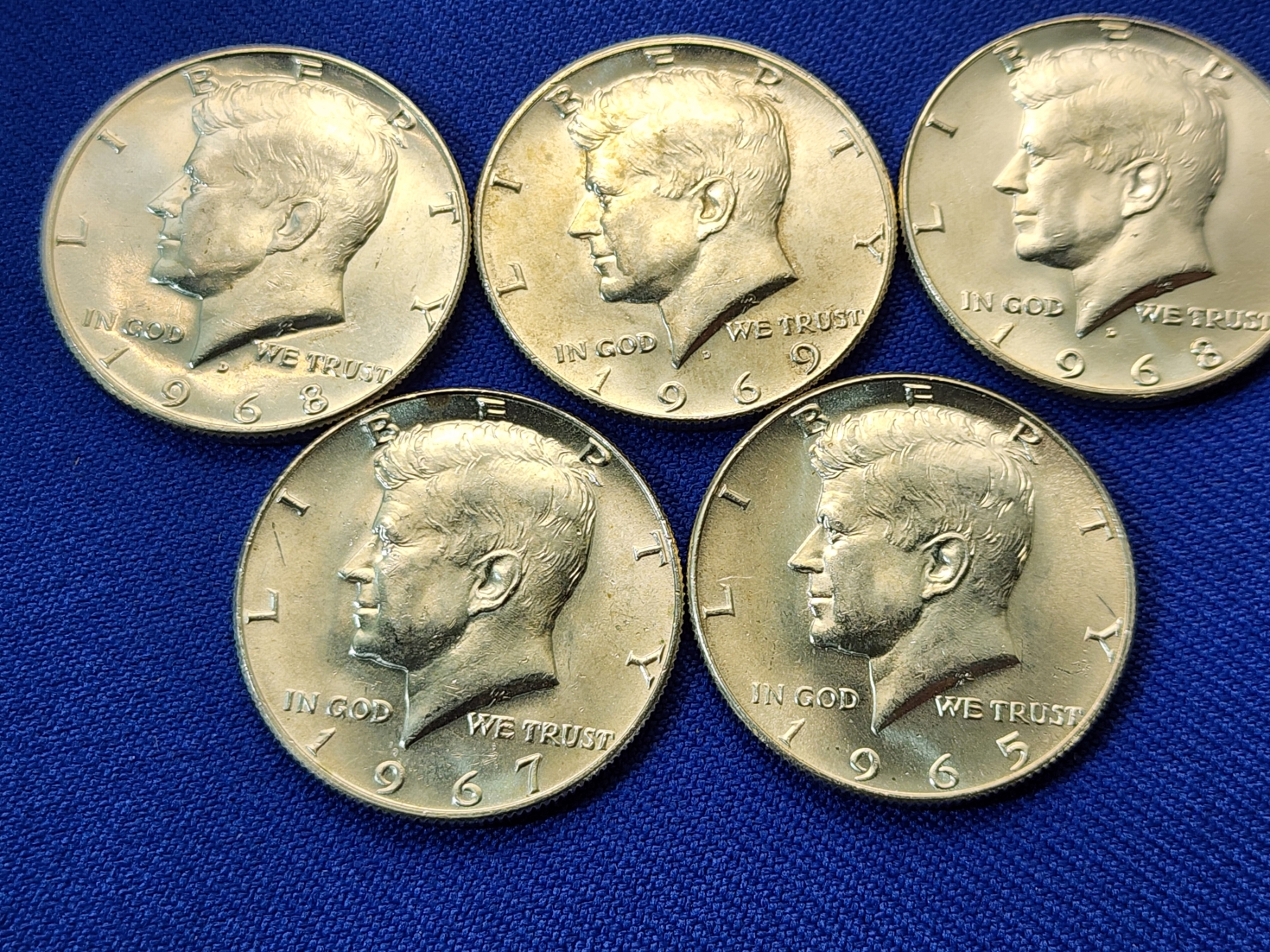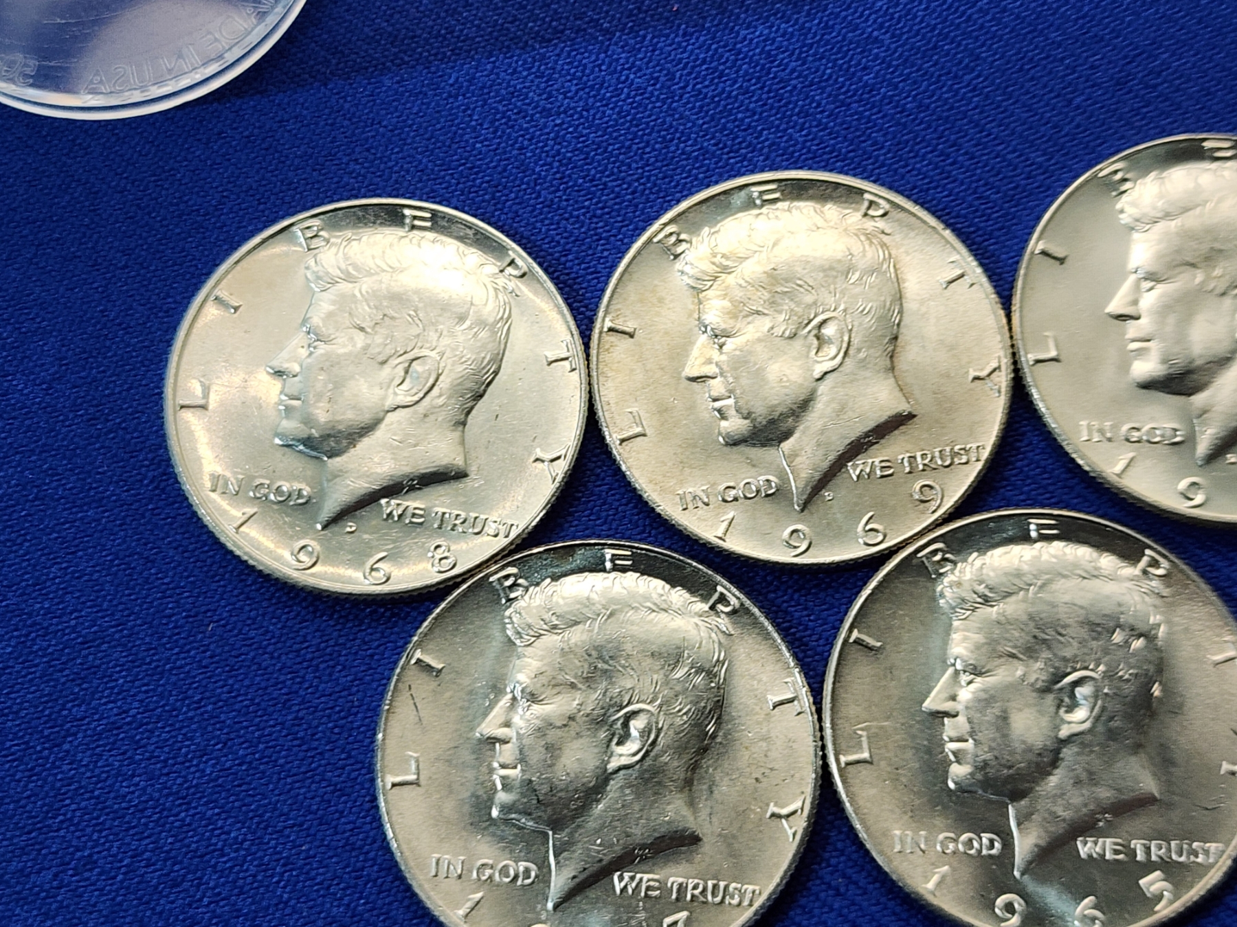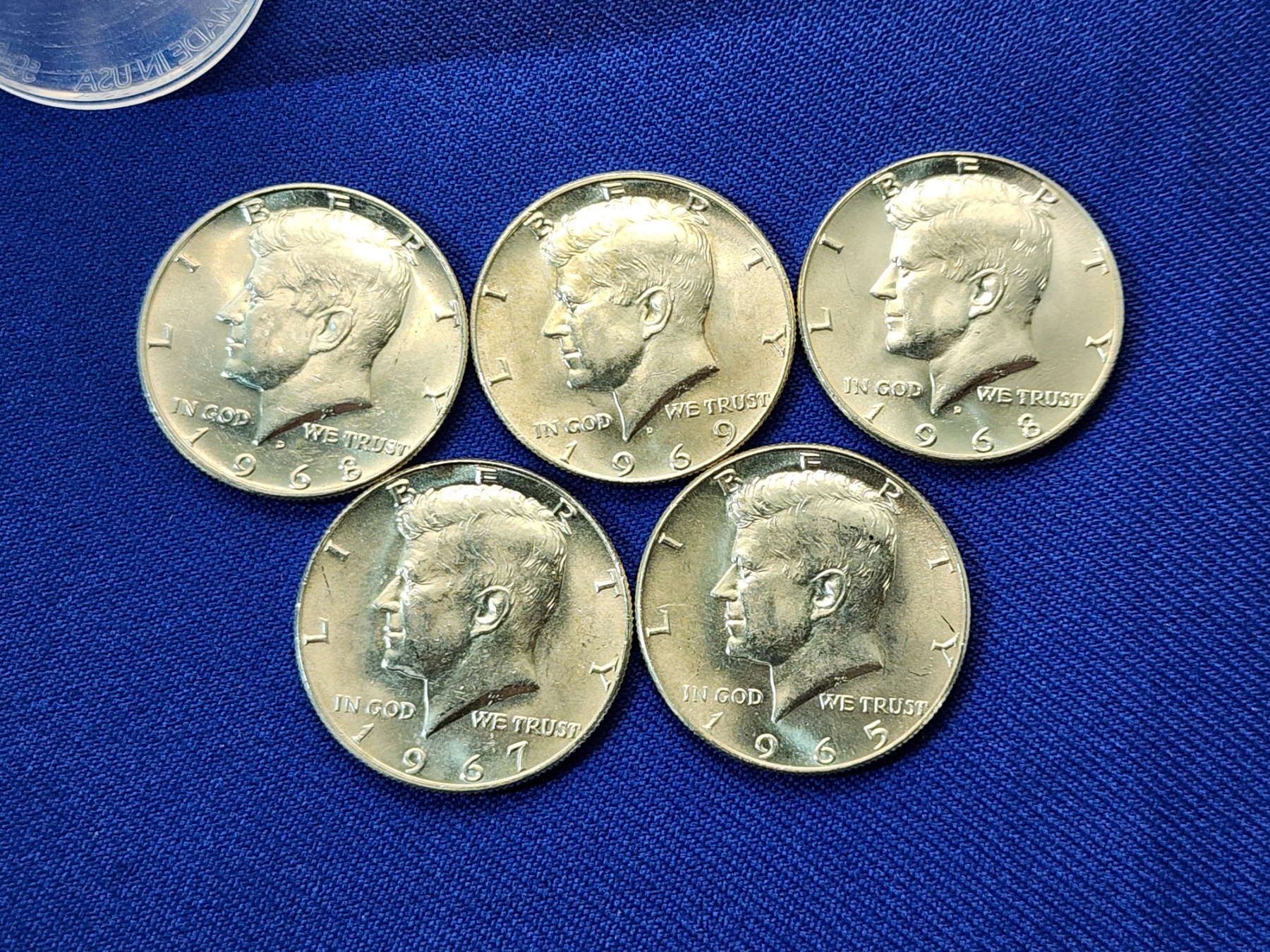 x5 Assorted Years Kennedy Half Dollars 40% Silver FV: $2.50 and Coin Tube