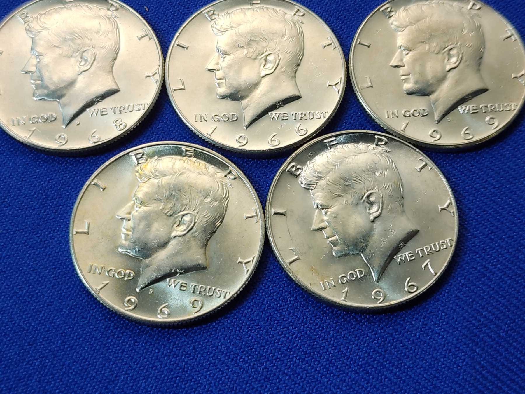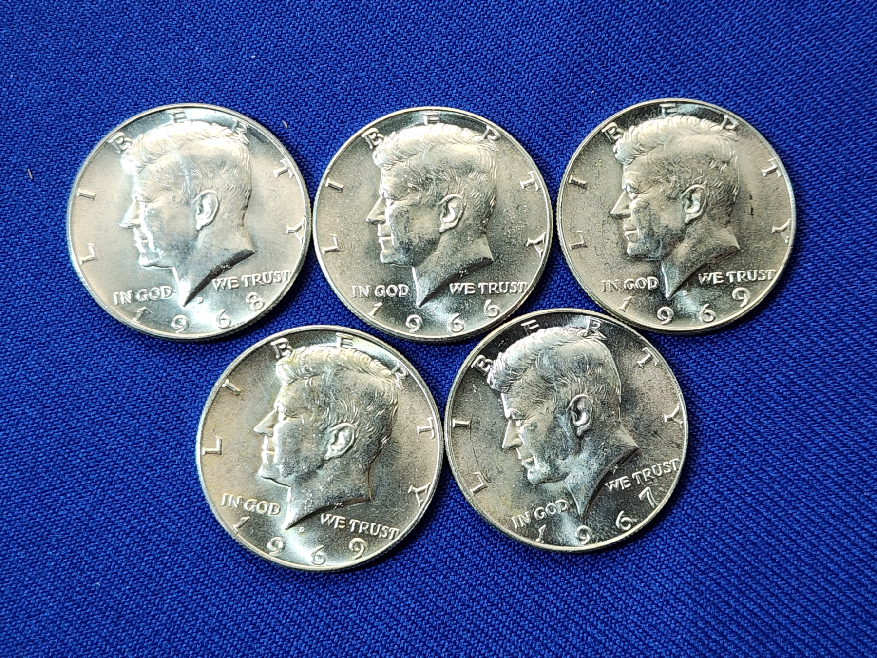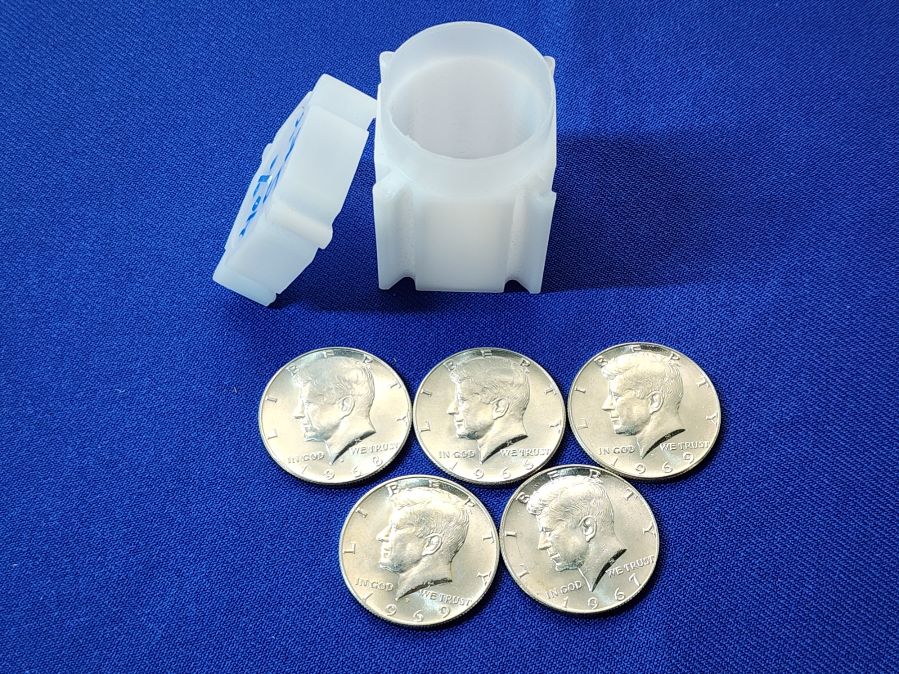 x5 Assorted Years Kennedy Half Dollars 40% Silver FV: $2.50 and Coin Tube